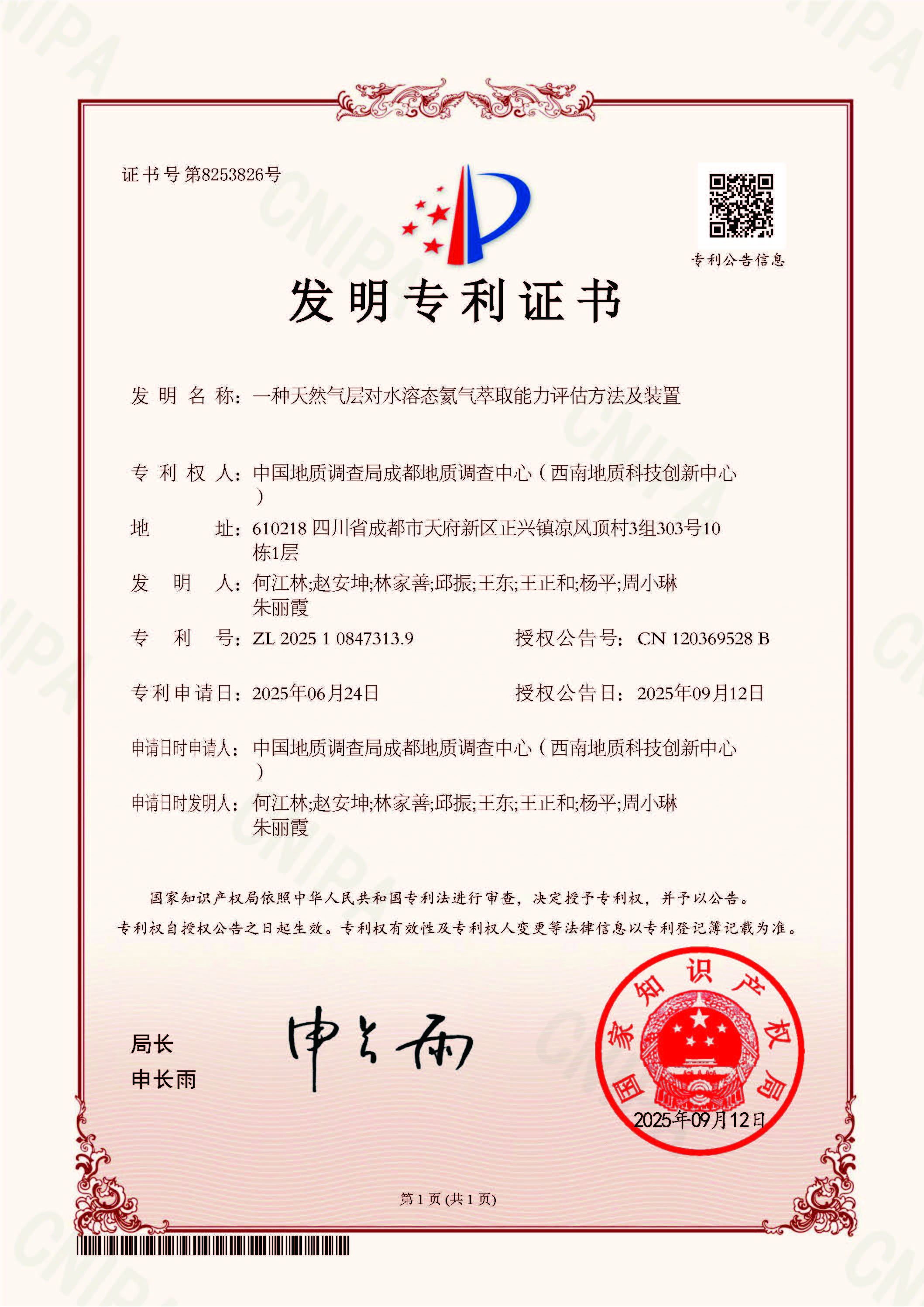 近日,由部重点实验室申请的发明专利“一种天然气层对水溶态氦气萃取能力评估方法及装置”获国家知识产权局授权。