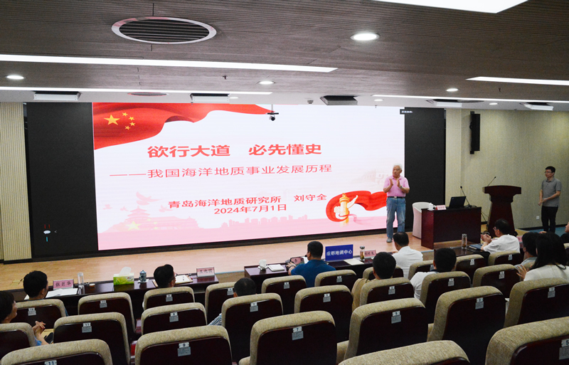 刘守全研究员以“欲行大道 必先懂史”为题,围绕地质事业的先贤们在困境中艰难探索、新中国海洋地质事业领导者们的远见卓识、我国海洋地质工作者的努力拼搏、海洋地质事业在新世纪腾飞、不断创造海洋地质事业的新辉煌等5个方面全面展示了我国海洋地质事业发展历程。他在授课中深情地说道:“没有共产党就没有新中国,没有共产党也就没有我国今天海洋地质事业的辉煌。”