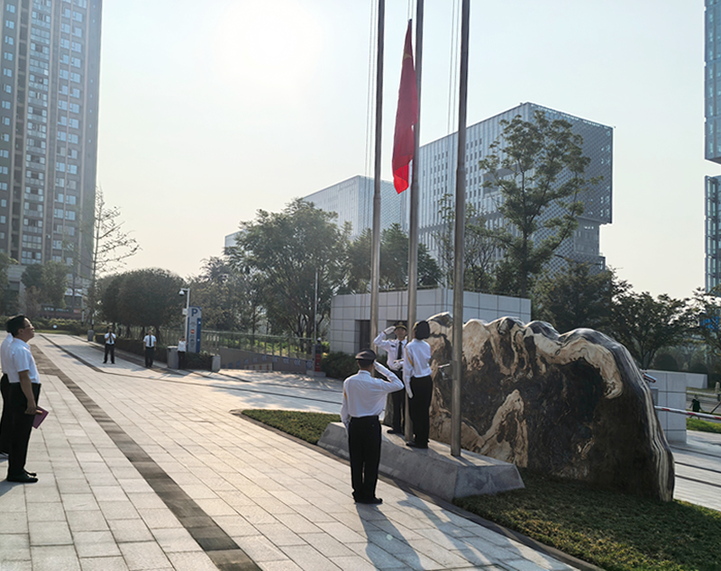 日出东方、光照大地,在雄壮激昂的音乐声中,全体干部职工目送国旗冉冉升起。国旗在空中高高飘扬,使命在心中牢牢铭记。
