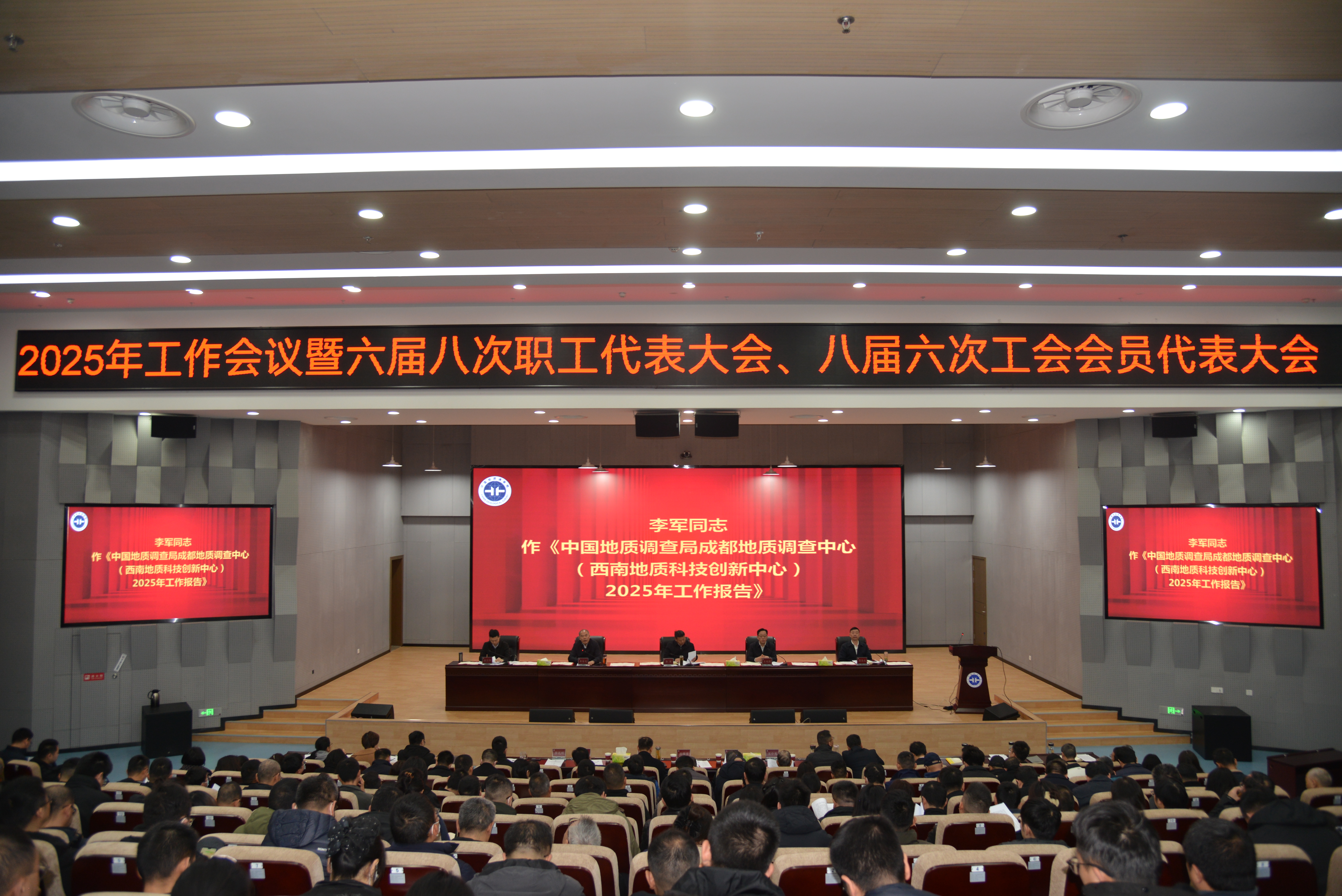 3月4日,中国地质调查局成都地调中心(西南地质科技创新中心)召开2025年工作会议暨六届八次职工代表大会、八届六次工会会员代表大会。会议以习近平新时代中国特色社会主义思想为指导,深入学习贯彻党的二十大和二十届二中、三中全会精神,认真落实全国自然资源工作会议、全国地质调查工作会议和中国地质调查局工作会议要求,总结2024年中心工作成效,部署2025年重点任务。成都地调中心主要负责同志及相关业务分管同志分别向会议作中心工作报告、工会工作报告及财务工作报告,并向会议汇报2024年职代会提案落实情况及2025年职代会提案说明。