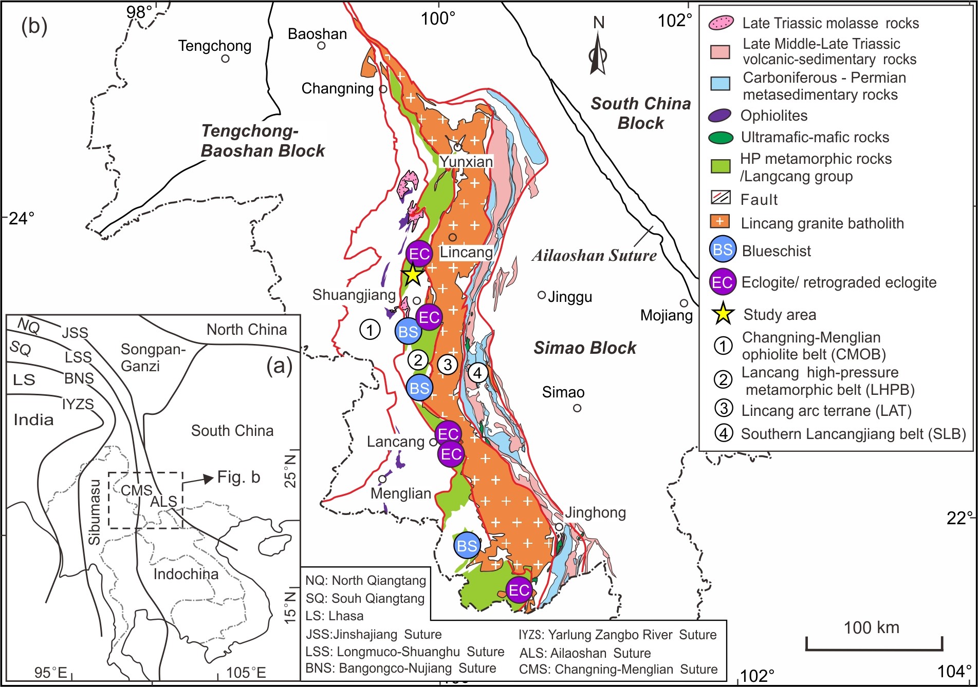 图1 (a) 青藏高原东南缘构造格架图; (b) 西南三江造山带南段构造单元划分及高压变质岩分布