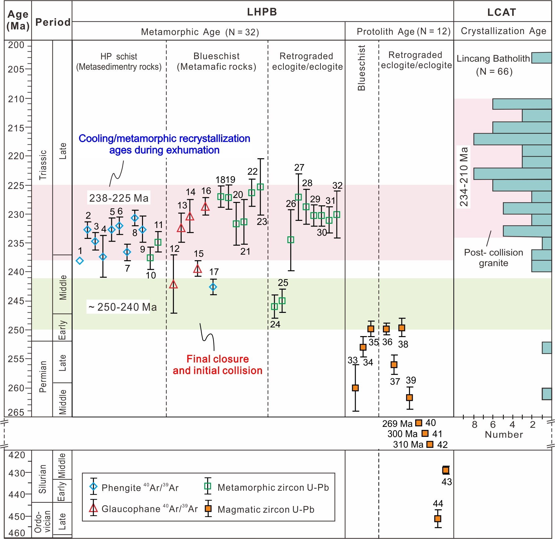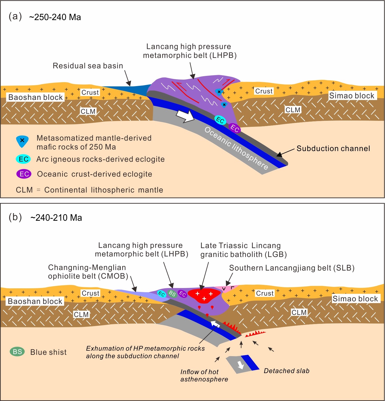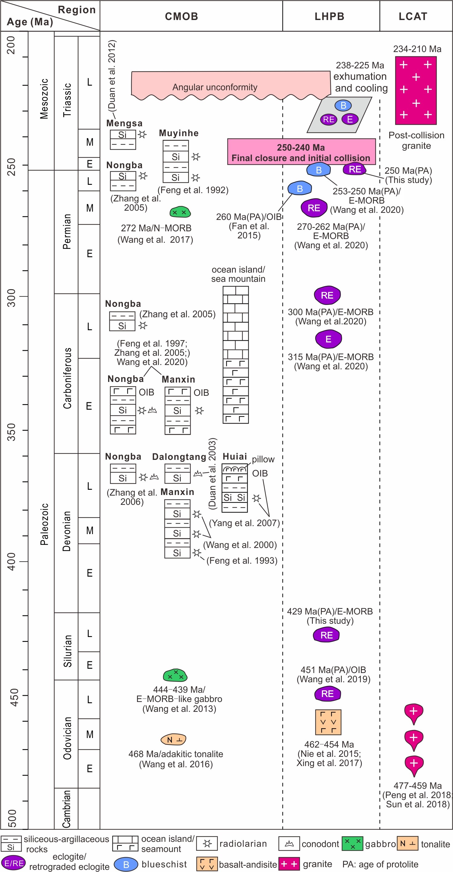 针对上述问题,研究团队对澜沧高压变质带退变榴辉岩开展了系统研究,取得了一系列新发现:(1)原岩时代与属性:勐库忙那退变榴辉岩的原岩是429±3 Ma E-MORB型洋壳,而根恨河退变榴辉岩的原岩为250±1 Ma弧型镁铁质岩。(2)变质时代及地质意义:忙那和根恨河退变榴辉岩锆石均具有岩浆核-变质边结构,变质边年龄分别为230±4 Ma和231±2 Ma,该年龄与其围岩多硅白云母40Ar/39Ar坪年龄232.6±2.2 Ma一致;锆石边部具有低Th/U比值、Eu负异常和平缓重稀土配分模式,边部有多硅白云母包裹体,部分锆石或边部具有筛状结构。锆石结构、微量元素特征及矿物包裹体证据,指示这些变质年龄记录的是板块折返过程中“减压、有流体”状态下的锆石变质生长/重结晶事件,而非榴辉岩相峰期变质作用。(3)大洋闭合准确时间:洋壳消亡殆尽之后最早陆壳型(弧型)高压变质岩的原岩年龄与早期变质年龄之间的时间范围为250~240 Ma,这一时间间隔是昌宁-孟连古特提斯洋闭合的最佳时间估计(图2)。(4)大洋存在时限:综合折返的洋壳型高压变质岩、早古生代蛇绿岩和岛弧型岩浆岩及早古生代沉积记录等多方面证据,揭示昌宁-孟连特提斯洋是存在于晚寒武世至二叠纪末期的大洋(图3)。该研究证实昌宁-孟连特提斯洋是一个从早古生代持续至二叠纪末的“原-古特提斯洋”,并于2.5~2.4亿年前最终闭合,随后发生了高压变质岩折返事件和后碰撞岩浆作用(图4)。这一突破性认识为重建东特提斯域的构造演化与古地理格局提供了新的、至关重要的约束,对深化理解全球特提斯构造动力学具有重大意义。