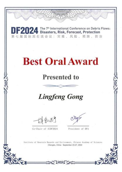 此次大会上,成都地调中心5名科技人员在各分会场做了学术报告,分享了中心地质灾害团队在高原冰碛土泥石流判识、火后泥石流形成机制及泥石流堵江灾害链评价等方向的最新研究成果。地质安全室龚凌枫博士作为分会场主持人与奥地利自然资源与生命科学大学Sven Fuchs教授共同主持完成议题6“Debris flows in snow and ice environment ”8个主题报告的交流,并获得了由会议主席颁发的“Best Oral Award”奖。