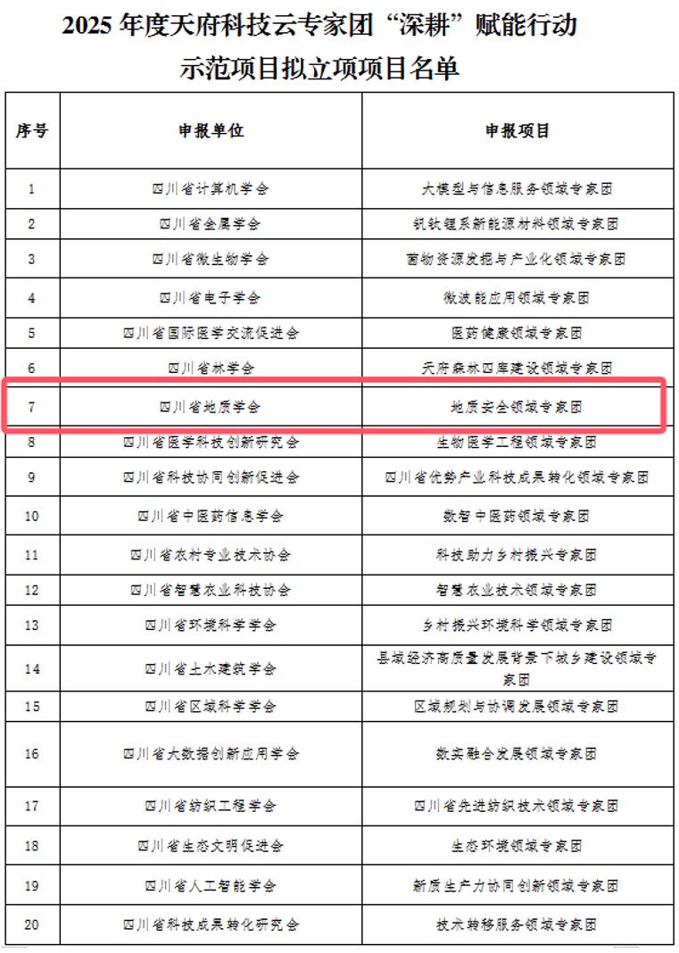 近日,四川省科学技术协会公示了关于2025年度天府科技云专家团“深耕”赋能行动示范项目拟立项名单,中国地质调查局成都地质调查中心(西南地质科技创新中心)地质灾害团队获批地质安全领域专家团。