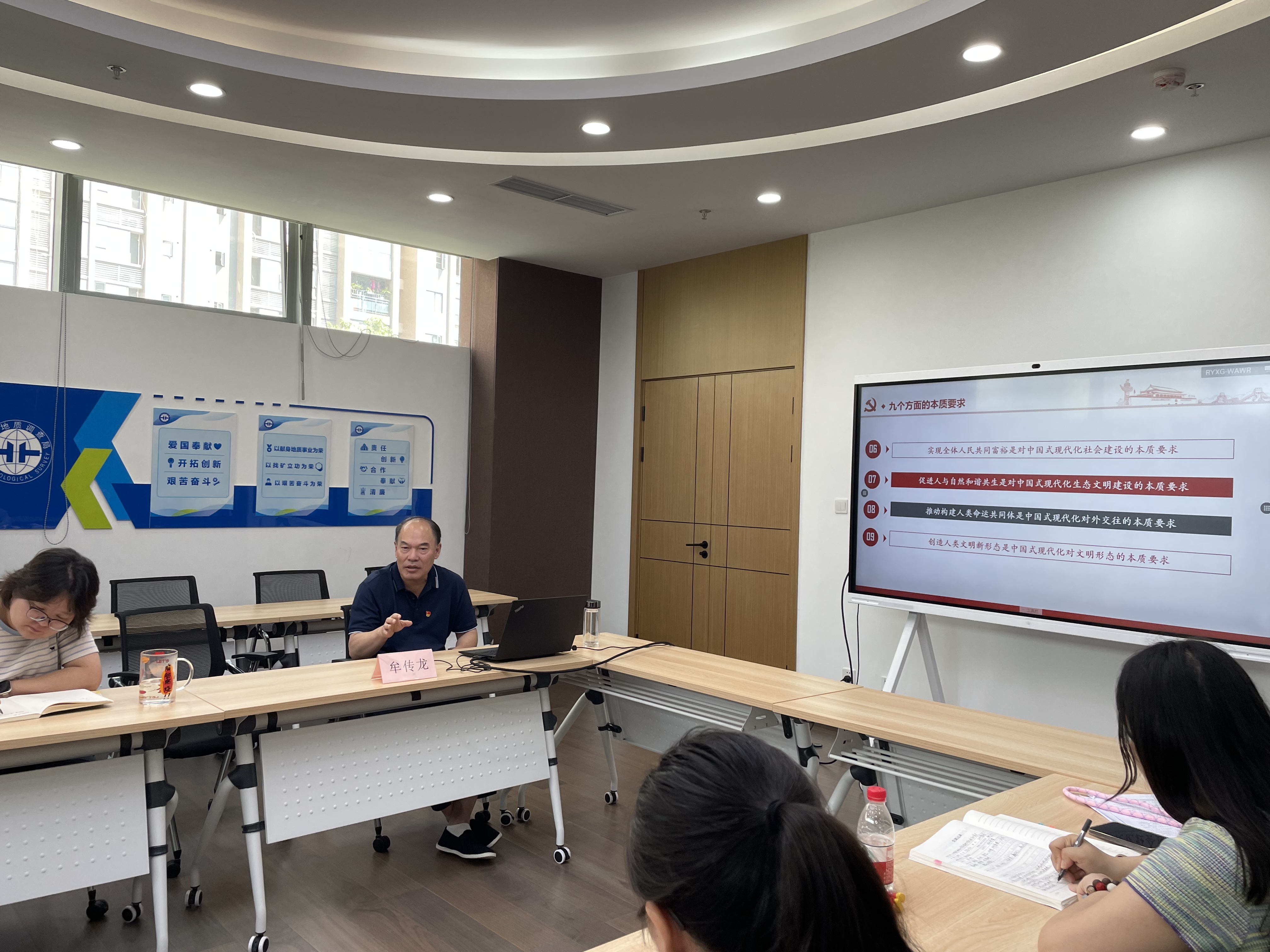 牟传龙同志为管理第一党支部全面解读了中国式现代化前进道路上必须牢牢把握的“坚持和加强党的全面领导、坚持中国特色社会主义道路、坚持以人民为中心的发展思想、坚持深化改革开放、坚持发扬斗争精神”等五项重大原则,介绍了中国式现代化“坚持中国共产党领导、坚持中国特色社会主义、实现高质量发展、发展全过程人民民主、实现全体人民共同富裕、促进人与自然和谐共生、推动构建人类命运共同体、创造人类文明新形态”等九项本质要求。党课还通过追溯西方现代化的建设过程,引用大量书籍、名家观点,呈现西方现代化主流叙事的思想体系,对比中西方现代化的内涵差异,介绍了中国式现代化的鲜明特点,即中国式现代化是人口规模巨大的现代化,是物质文明和精神文明相协调的现代化,是人与自然和谐共生的现代化,是走和平发展道路的现代化。党课鲜明地指出,只有依靠中国式现代化才能全面推进中华民族伟大复兴。