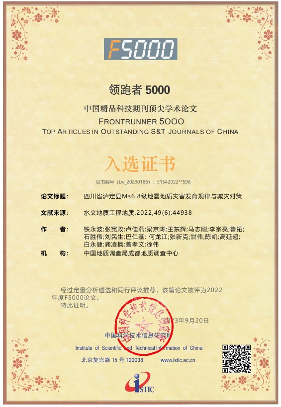 近日,中国科学技术信息研究所公布了2022年度“领跑者5000——中国精品科技期刊顶尖学术论文”,成都地调中心团队牵头发表在《水文地质工程地质》(2022,49(6):44938)的论文《四川省泸定县Ms6.8级地震地质灾害发育规律与减灾对策》入选。据不完全统计,该论文自2022年9月16日发表以来,已累计下载1200余次。