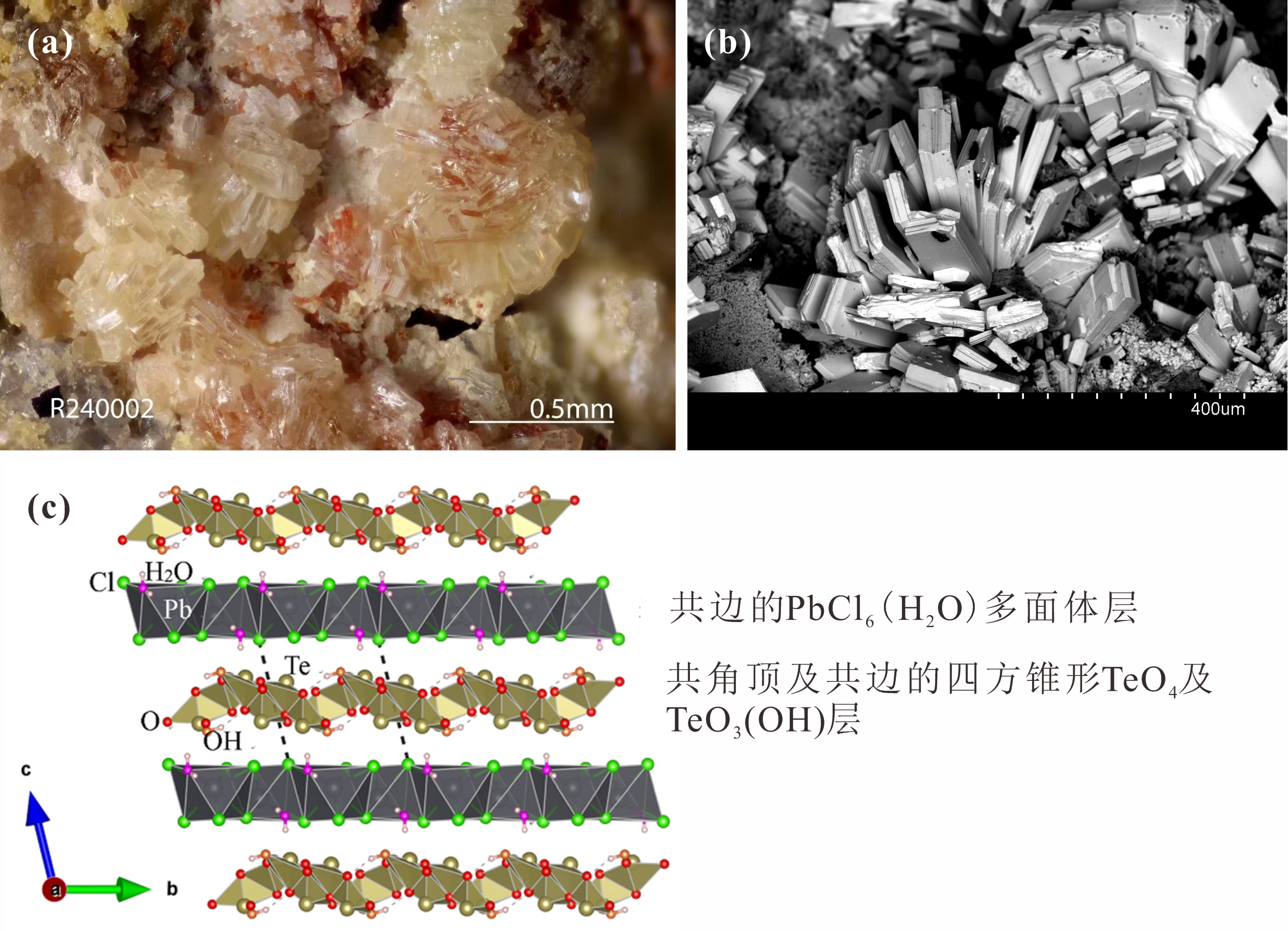 图1 沈敢富石在光学显微镜(a)及扫描电镜(b)的形貌特征, 及晶体结构(c),沿a轴方向视域,示平行(0 0 1)的共边的PbCl6(H2O)多面体层和共角顶及共边的四方锥形TeO4及TeO3(OH)层。