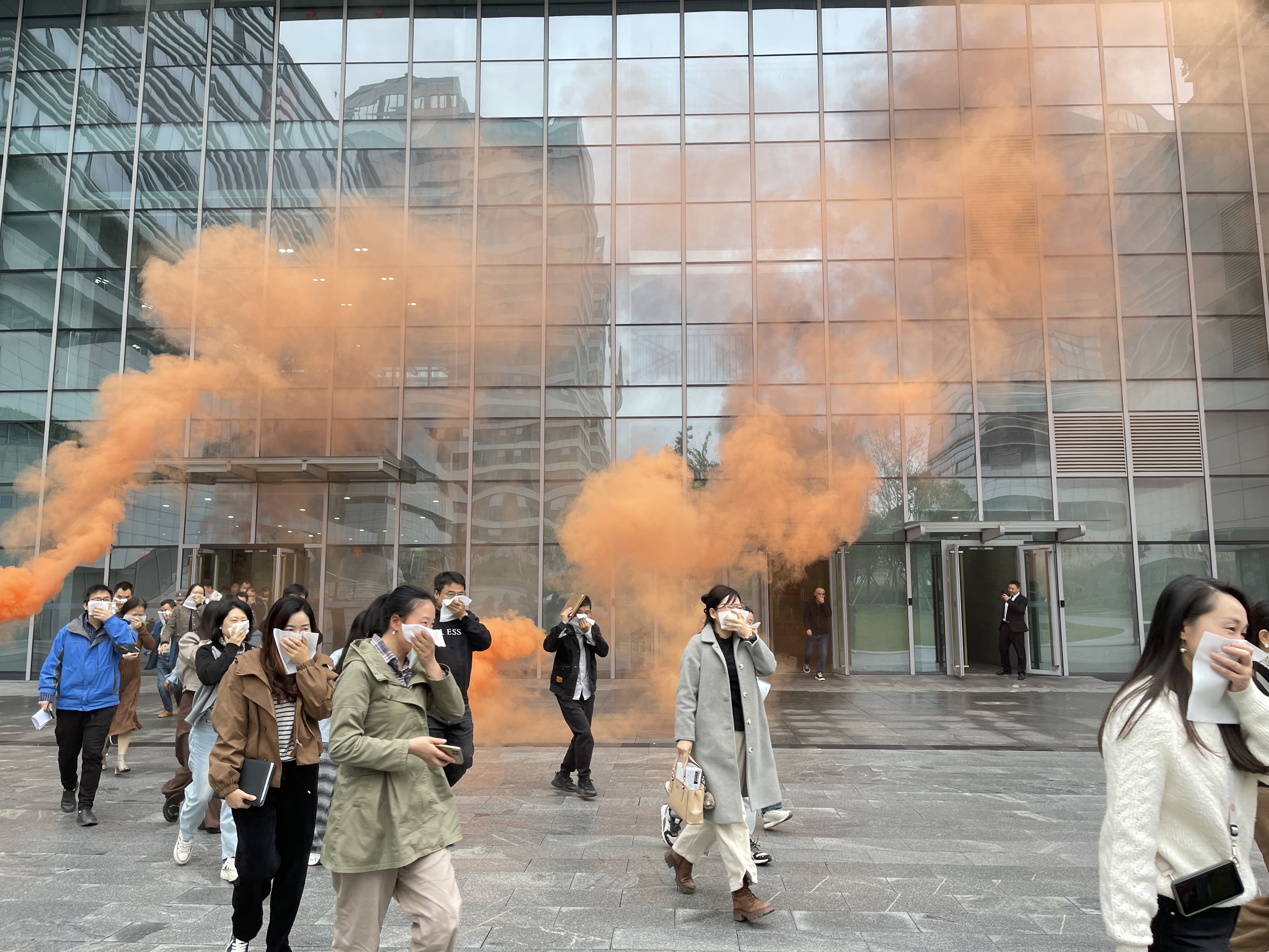 现场培训结束后,随着急促的哨声响起,“以学促干”的消防演练正式开始。培训模拟大型会议室因设备短路突发火灾,伴随滚滚浓烟,参会人员在应急引导员指引下,迅速按照疏散路线,规范有序地撤离到安全地带。本次演练应急总指挥对活动进行了总结点评,肯定了参加演练人员的表现,并提出改进建议。
