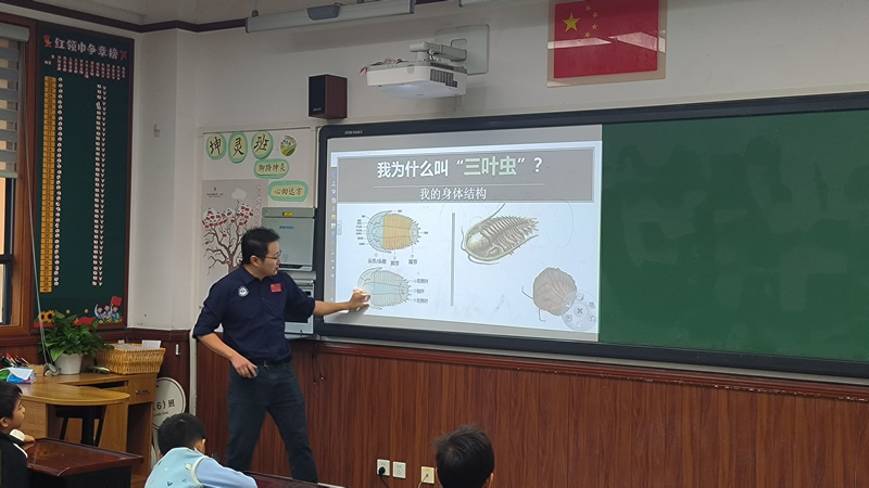 侯林研究员向天府一小一年级小朋友展示数亿年前的海洋霸主——三叶虫