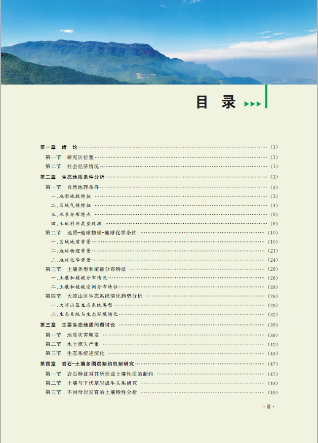 本专著基于上述探索成果,选取大凉山段作为研究区,该区域兼具高寒山区、干热峡谷和中山宽谷盆地等多种地貌单元,具有显著代表性。研究团队以地质建造为基础,提出了成土母质单元的划分方案,并将土壤类型融入成土母质单元,建立了生态地质单元分类体系。从岩石—土壤—生态系统整体研究的视角出发,系统分析了不同岩石类型发育形成的土壤特性,归纳总结了各生态地质单元的生态功能属性,全面开展大凉山段生态地质评价,并就区域生态保护与修复、国土空间用途管制等方面提出了具有针对性的对策和建议。