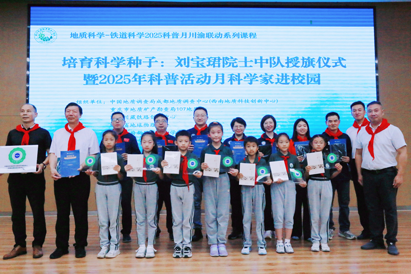 活动启动仪式上,成都地调中心副主任廖忠礼研究员为学校授予“刘宝珺中队”队旗,并赠送《刘宝珺传》,以此致敬老一辈科学家的求真精神,将科学火种深植青少年心中。天府十一学校副校长裴刚老师代表学校接过了队旗和赠书,并表示这是播撒在同学们心中的科学种子,必将在同学们身上生根发芽。