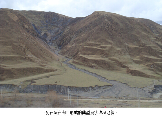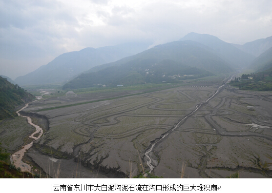 在山区,经常会看到泥石流发生后在沟口堆积形成的扇状堆积地貌,其形态很像是一把扇子,又似一个平面上的小喇叭。为了能形象地比喻这类泥石流形成的堆积地貌,将其称为泥石流堆积扇。在云南省东川市,由于当地岩体破碎,泥石流频繁发生,几乎每条沟口都有泥石流堆积形成的扇状地貌,当地人形象地用“座座山头走蛟龙,条条沟口吹喇叭”来描述这里的泥石流现象。