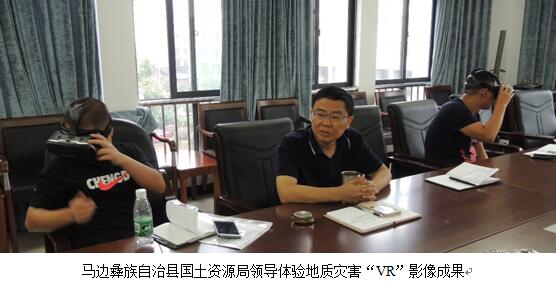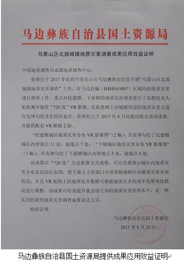 马边县国土资源局主要负责人及有关管理人员现场体验了民建镇地质灾害分布VR影像图的效果,认为该成果以全息影像方式展示地质灾害特征,使地质调查成果可读性更强,便于地方主管部门全面掌握城镇区内地质灾害分布情况,可有效提升国土局的地质灾害管理水平,是一种实用的新型地质灾害调查成果表达方式,将是下阶段马边县城镇地质灾害管理的主要技术手段之一。马边彝族自治县国土资源局为该项成果开具了“成果应用效益证明”。