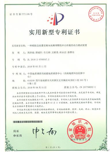近日,由自然资源部中国地质调查局成都地质调查中心申报的2项实用新型专利“一种模拟边坡遭受侧向高频周期性冲击荷载的动力测试装置”和“一种模拟隧道遭受高频周期性底入式侧向式冲击荷载的动力测试装置”,顺利通过国家知识产权局审核并获得授权(专利号:ZL2018 2 0709547.2和ZL2018 2 0706049.2)。