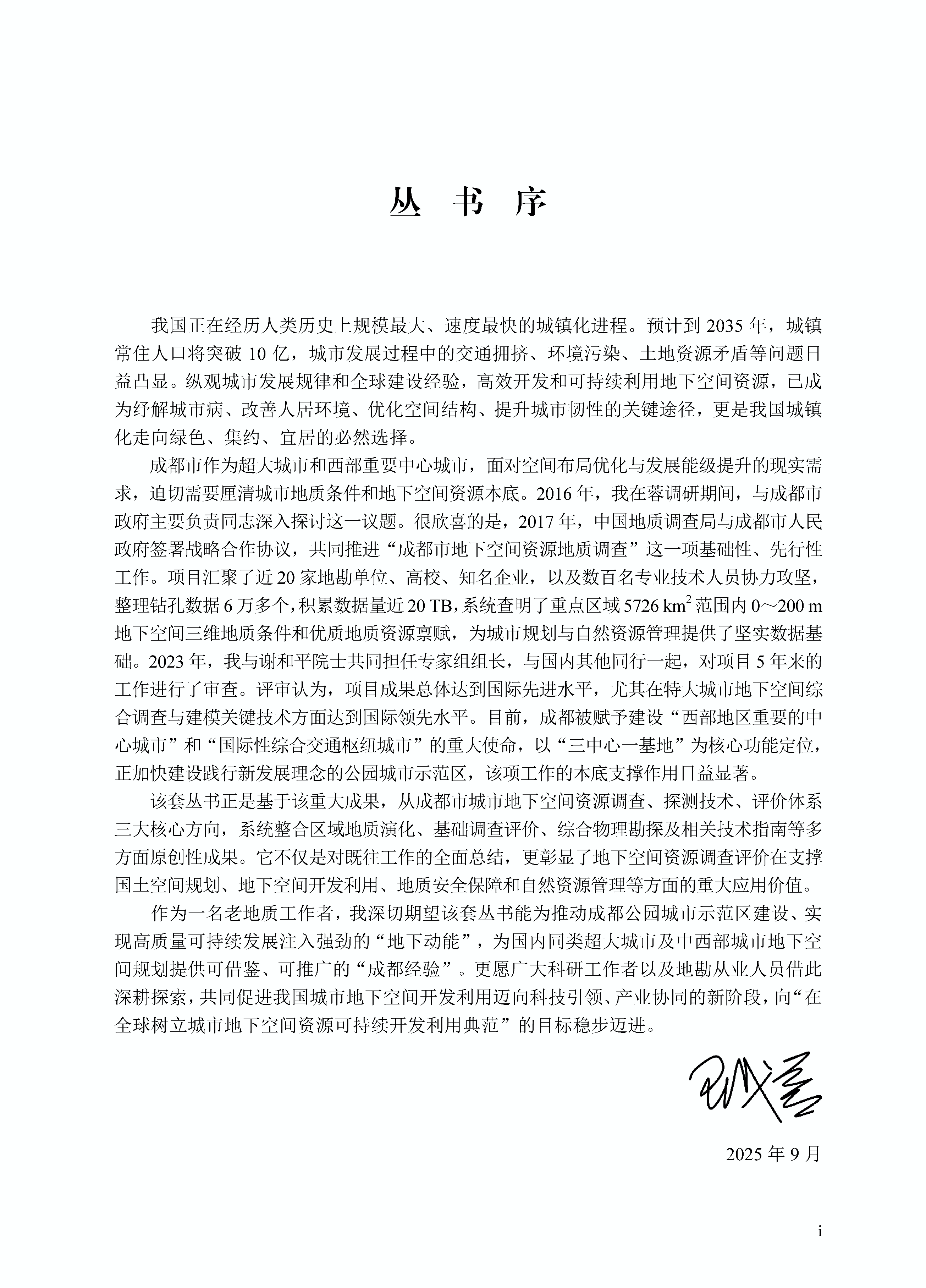 该专著是“成都市城市地质与地下空间资源丛书”系列的开篇之作,丛书由王成善院士作序,高度评价了开展成都市地下空间资源相关工作对践行新发展理念的本底支撑作用,更希望将“成都经验”推广到国内同类超大城市,为实现高质量可持续发展注入强劲的“地下动能”。