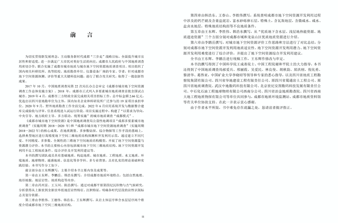 2018年起,成都地调中心承担中国地质调查局公益性地调项目“成都多要素城市地质调查”(实施周期2018—2020年),并作为技术支撑单位统筹实施由成都市地方财政出资的“成都市城市地下空间资源地质调查”(实施周期2018—2022年)项目,该专著正是基于上述工作的核心成果,在地质测量、多参数钻探、综合物探等工作手段的基础上,扎实总结了成都市地下空间资源开发利用不良工程地质条件,系统查明了地下水、浅层地热能、地质遗迹等优质地质资源,通过建立不同尺度、不同精度、多参数、全属性的三维地下空间地质结构模型,全面刻画成都市地下空间资源家底,首次系统开展地下空间资源的多维度评价,为成都市地下空间资源合理、有序开发利用提供了地学支撑。