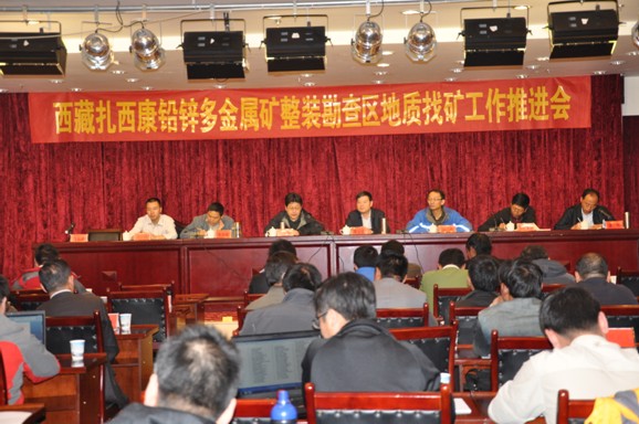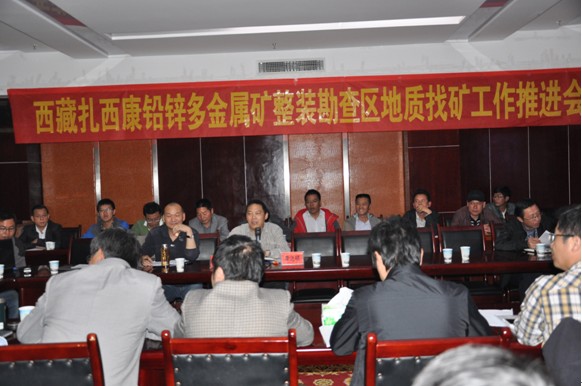 在会议开幕式上,中国地质调查局发展研究中心副主任蔡纲对全国重点整装勘查区地质找矿工作推进情况进行介绍,西藏国土资源厅副厅长王军、山南地区行署副专员黄金城和山南地区国土资源局长渠伟对扎西康铅锌多金属矿整装勘查地质找矿工作提出了明确要求,措美县、错那县和隆子县主管副县长对支持整装勘查工作做了表态发言。随后的会议由扎西康整装勘查区技术总监李光明研究员主持,整装勘查区各矿业权人对已有的工作成果、2013年工作安排、经费投入情况以及存在的主要问题进行了汇报,武警黄金部队三总队第11支队和成都地质调查中心对在整装勘查区开展的承担公益性地质工作取得的主要成果与进展进行了交流。在讨论中,参会代表踊跃发言,对整装勘查区地质找矿工作中存在的关键地质问题其它相关问题进行了热烈的讨论,国土资源部整装勘查技术指导专家次旺多吉对会议进行了总结。