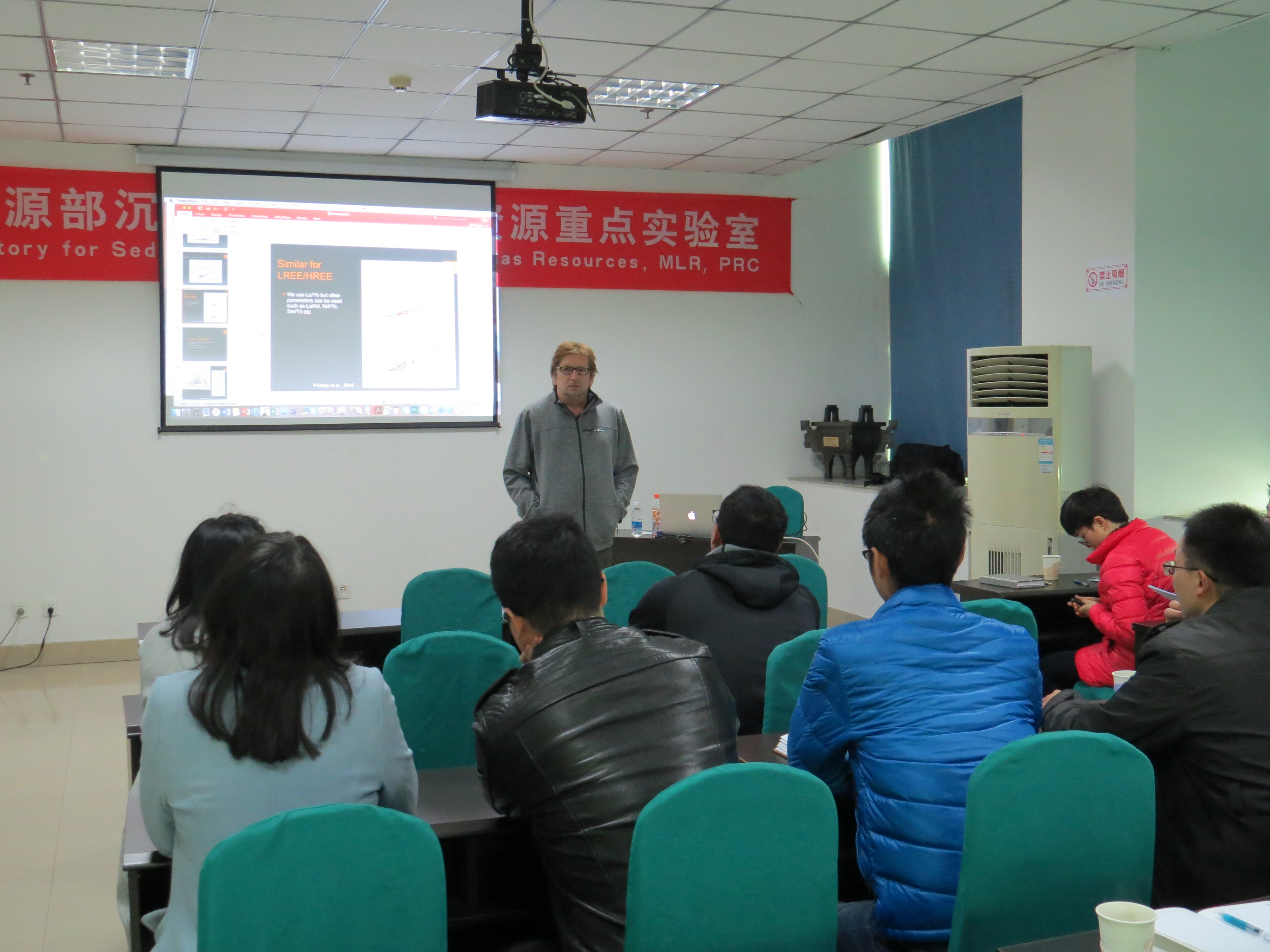 Ducea教授系统介绍了同位素测年方法在沉积学以及地质构造演化研究中的应用,重点介绍了Sr同位素法在碳酸盐岩定年中的应用,并剖析了TIMS,ICP-MS等测年设备的使用方法及原理,总结了K-Ar,Ar-Ar,U-Pb,U-Th-He等测年方法适用的封闭温度及地质体。与会人员在报告会后就相关问题与Ducea教授展开了激烈的讨论。