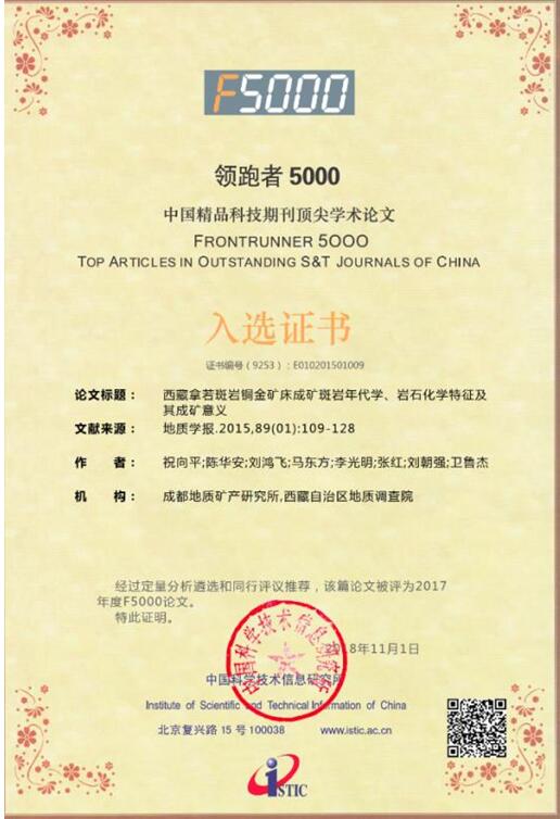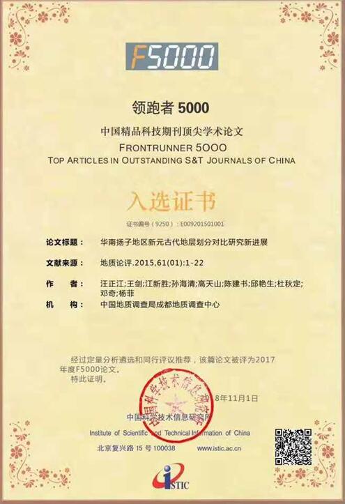 近日, 2017年度“领跑者5000-中国精品科技期刊顶尖学术论文平台(F5000)”评选结果出炉,自然资源部中国地质调查局成都地质调查中心三篇文章入选。他们是《华南扬子地区新元古代地层划分对比研究新进展》(《地质论评》2015年第61卷,第1期),《西藏拿若斑岩铜金矿床成矿斑岩年代学、岩石化学特征及其成矿意义》(《地质学报》2015年第89卷,第1期),《川南及邻区龙马溪组黑色岩系矿物组分特征及评价》(《石油学报》2015年第36卷,第2期)。