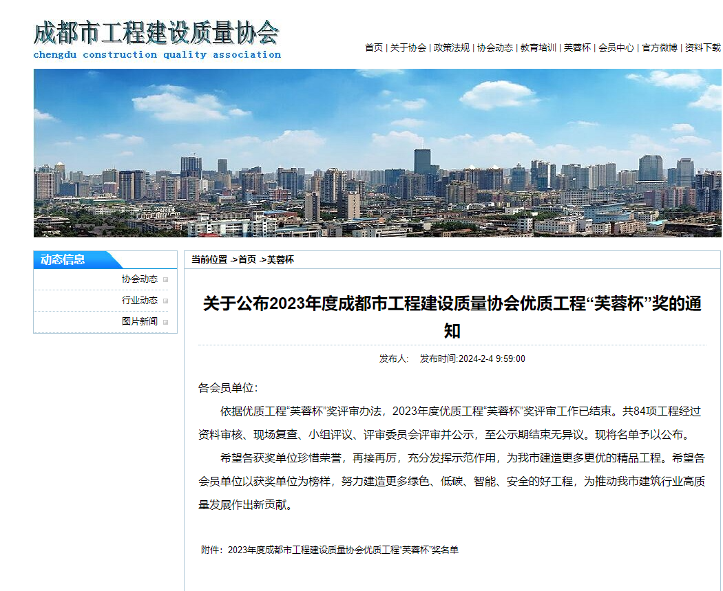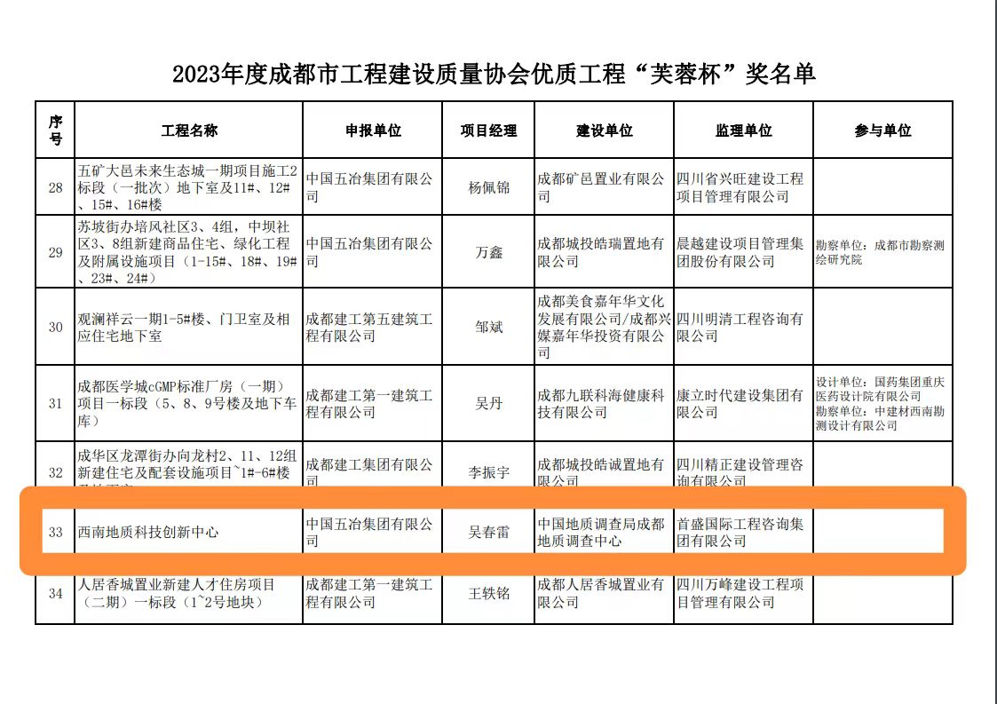 近日,成都市工程建设质量协会官网公布了《2023年度成都市工程建设质量协会优质工程(芙蓉杯)的通知》,西南地质科技创新中心基地建设工程荣获2023年度成都市工程建设质量协会优质工程“芙蓉杯”奖。这是西南地质科技创新中心基地建设工程继2022年获得四川省住房和城乡建设厅年度“四川省结构优质工程奖”以后,获得的又一建筑工程领域市级以上奖项。