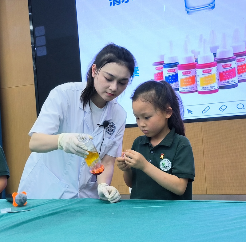 活动中,成都地调中心实验室陈瑜工程师先向学生们深入浅出地介绍了地球的组成结构、板块运动和火山作用基本知识。然后逐一演示了《火山喷发模拟实验》《大象牙膏实验》《海底熔岩模拟实验》等三个实验,并邀请了学生代表亲自动手操作,使他们在实践中深化对地质知识的理解。
