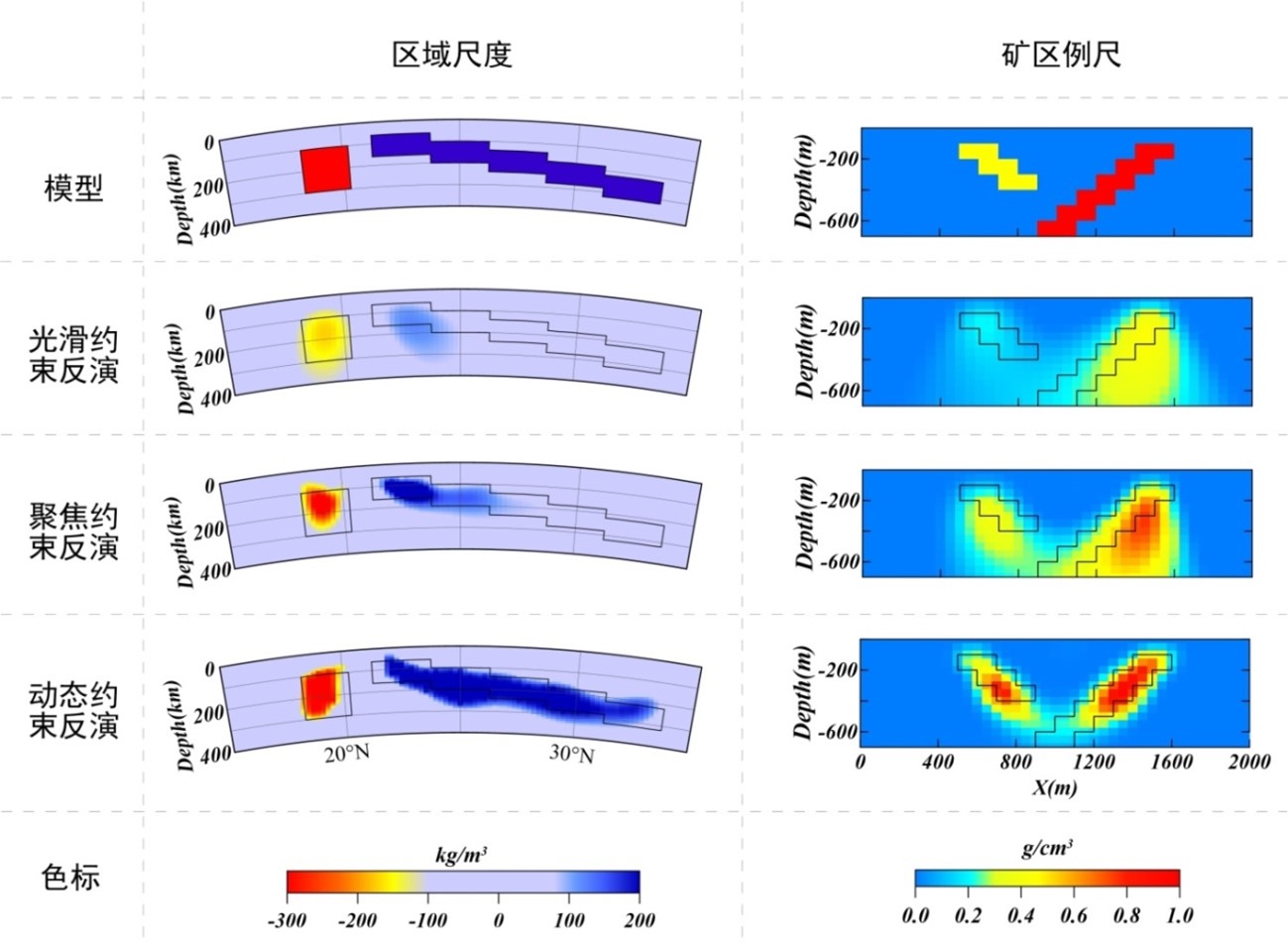卫星与地面重力数据覆盖范围广、点位分布均匀,这为探索青藏高原密度结构提供了坚实数据支撑。然而,重力反演——即从重力数据中恢复地下密度结构的过程,面临着结果模糊与计算成本高昂的双重挑战。为克服这些难题,中国地质调查局成都地质调查中心(西南地质科技创新中心)地球物理团队,经过数年研发与迭代升级,推出基于BKM-RRCG(分块核矩阵再加权正则化共轭梯度法)和动态约束的重力反演方法,在显著降低反演成本的同时,极大提高了反演结果的分辨率,特别是在识别深部缓倾斜异常和弱异常方面表现出色(图1)。
