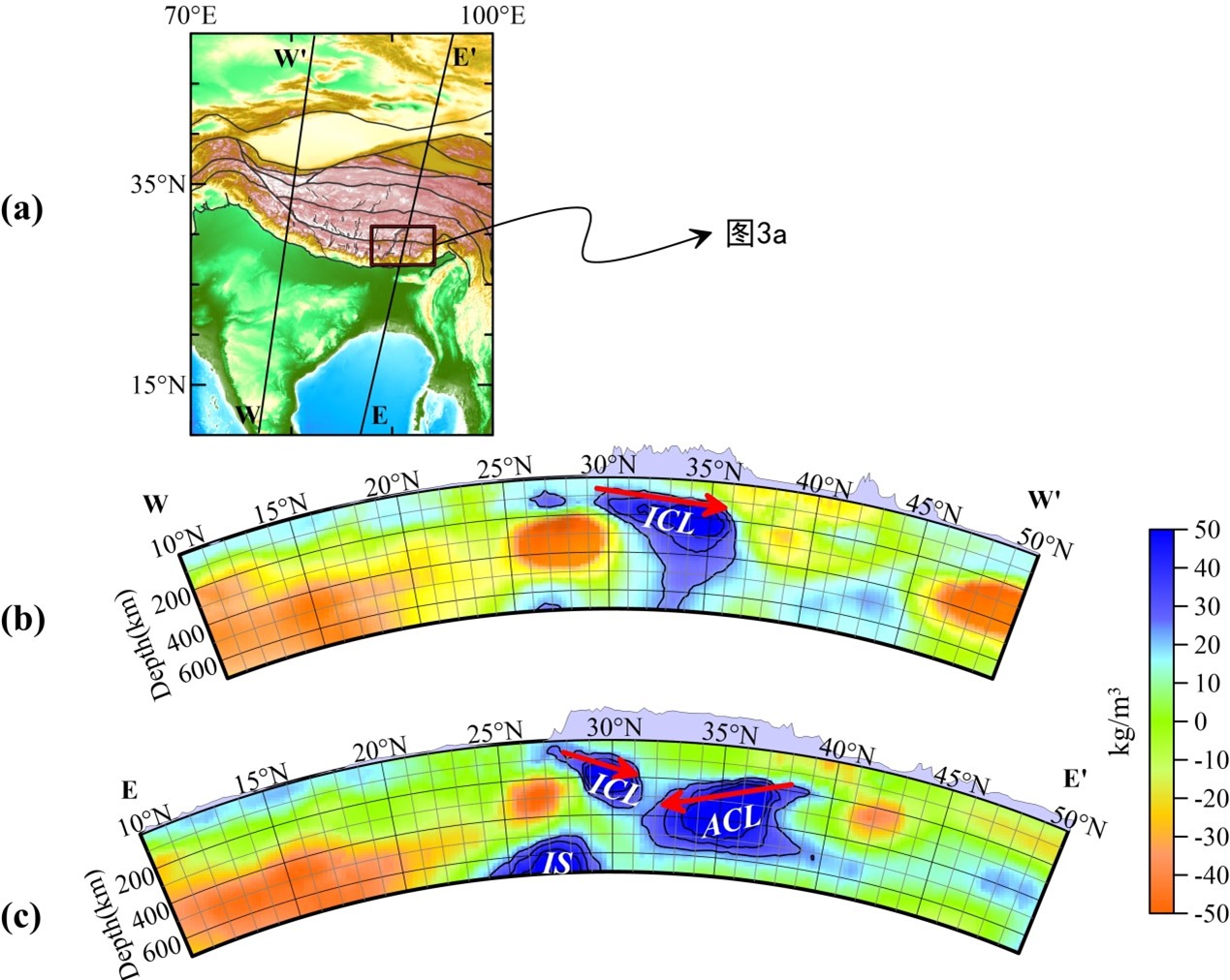 利用这一创新技术,团队成功获取了青藏高原东南部和更广泛区域两个不同尺度的密度结构信息(图2a)。通过分析密度异常,团队发现青藏高原深部结构在东西方向上存在显著的差异(图2,图3):大致以近南北向的亚东-谷露裂谷,高密度的印度板块在高原东部之下可能呈陡俯冲的几何形态,其地幔缝合线位于雅鲁藏布江缝合带以南,同时,在双湖地堑以东的高原北部之下,亚洲板块还具有向南俯冲的特征;而在高原西部之下,印度板块则呈近水平俯冲的几何形态,其北部前缘最远可能抵达塔里木盆地南部附近。这种东西明显不同的深部结构为揭示青藏高原东西向不对称的隆起机制、东西不同的构造活动机制以及岩浆活动机制提供了重要线索。