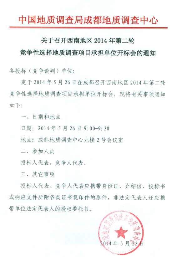 关于召开西南地区2014年第二轮竞争性选择地质调查项目承担单位开标会的通知
