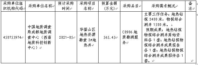 为便于供应商及时了解政府采购信息,根据《财政部关于开展政府采购意向公开工作的通知》(财库〔2020〕10号)等有关规定,现将中国地质调查局成都地质调查中心2021年度4-5月地质调查项目委托业务政府采购意向公开如下: