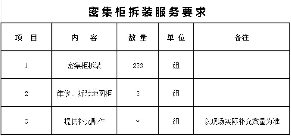 六、质量要求:报价人应严格按照采购人要求提供合格服务,完成一环路老基地一层资料室密集架、地图柜拆卸服务,并在天府新区基地一层资料室完成安装服务,保证拆装过程货物无损坏(详见附件2)。