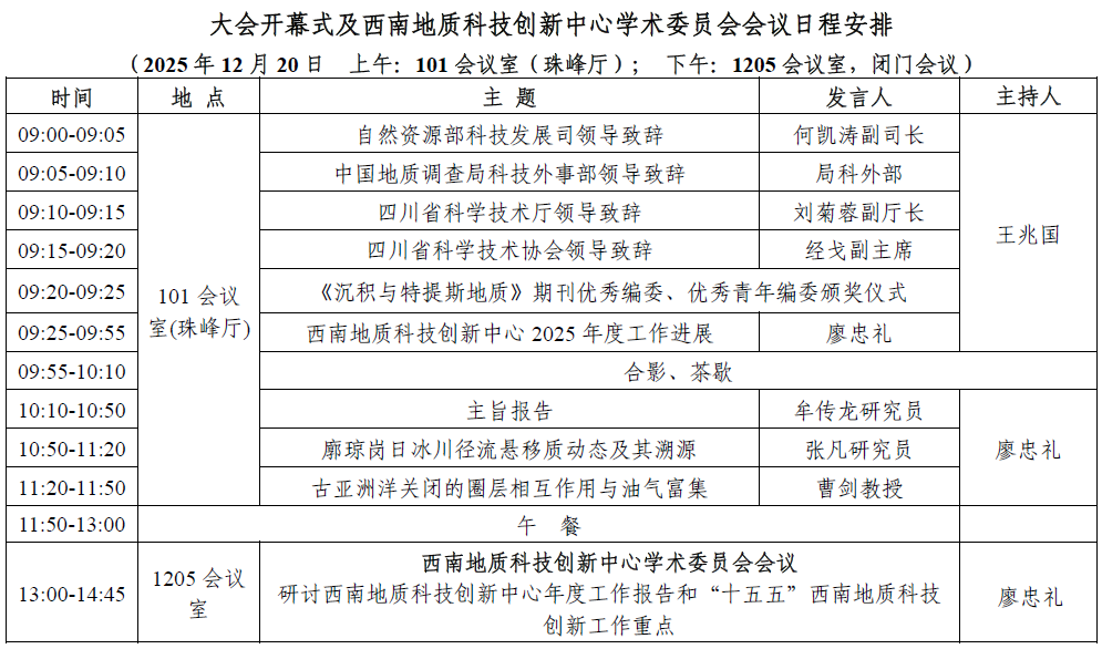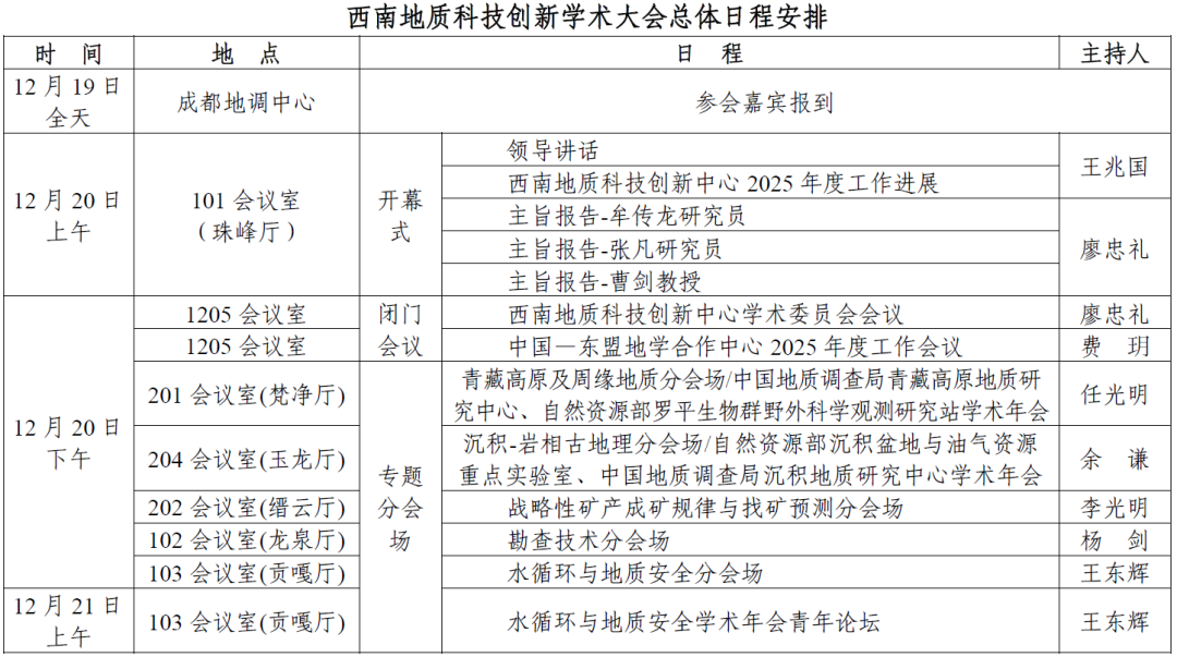 “十五五”规划明确强调,要坚持创新在我国现代化建设全局中的核心地位,把科技自立自强作为国家发展的战略支撑。为共谋“十五五”时期西南地质科技发展,中国地质调查局成都地质调查中心(西南地质科技创新中心)定于2025年12月19日至21日在成都举办“西南地质科技创新2025学术年会”。会议主要安排包括开幕式、西南地质科技创新中心学术委员会会议、中国—东盟地学合作中心2025年度工作会议及五个专题分会场活动。诚邀西南地区各省地勘单位、科研院所、高等院校和相关企事业单位的领导专家拨冗参会,携手推动西南地质科技创新再上新台阶。