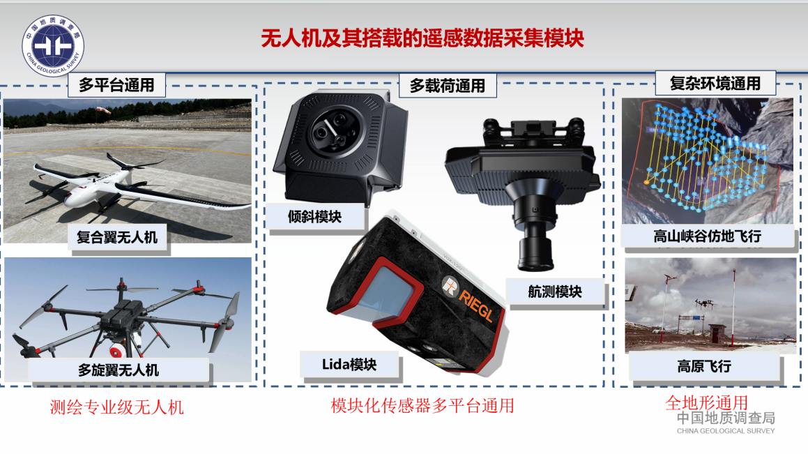 空地联合探测体系形成。实现了无人机航磁、无人机多载荷遥感、无人机贴近摄影等装备的配套应用。随着无人机高光谱、探地雷达、航放、航重等系统的加入,勘查技术服务能力将得到极大延伸。