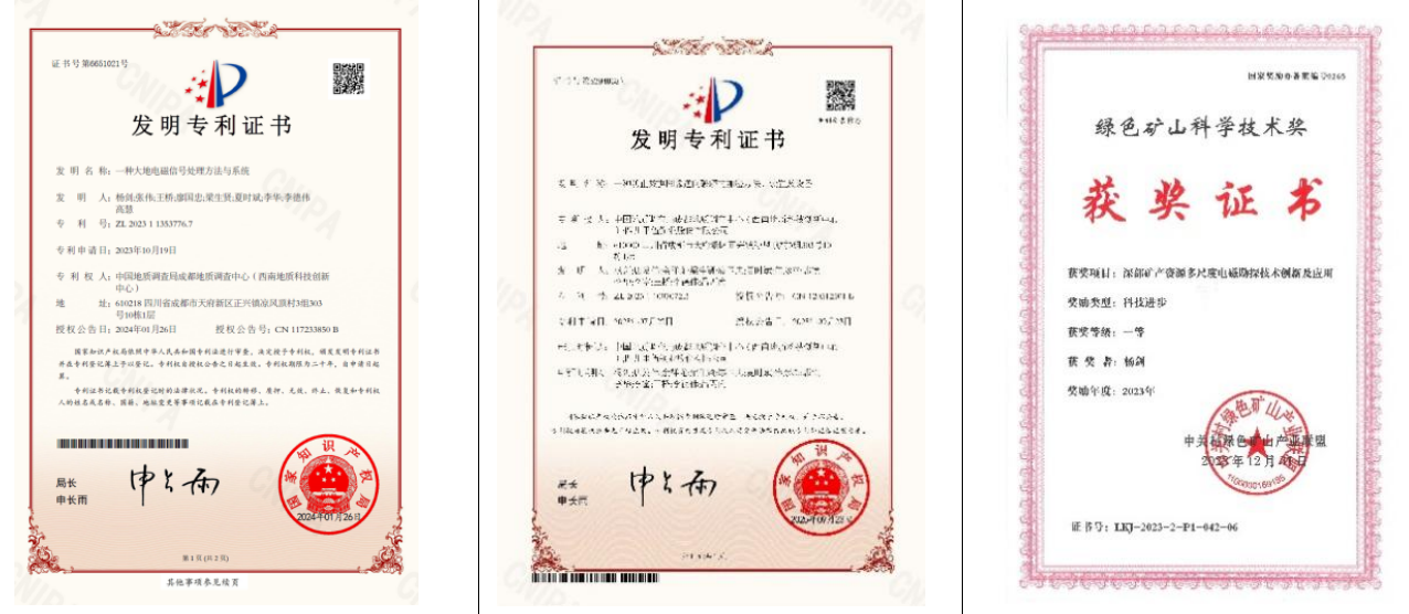 首次在西南地区开展陆域大地电磁基础网建设,初步构建覆盖面积超过10万平方千米的50千米×50千米网度的陆域大地电磁基础网,首次获得了四川盆地西南缘岩石圈高精度三维电性结构模型。首次系统整理西南地区化探数据,编制成矿带地球化学图,成功恢复西藏地区1∶20/25万区域化探30余个图幅数据,涉及面积约30万平方千米,盘活国家投资上亿元的数据资产。遥感多方法在中心多领域实现首次应用,卫星高光谱矿物蚀变填图2000余平方千米,助力西藏高寒高海拔地区找矿突破。成功采用无人机激光雷达、合成孔径雷达干涉测量(InSAR)技术,服务重大工程、大型城市、活动断裂等地表形变监测,覆盖面积达到3500平方千米以上。首次探索生态地质调查方法,构建西南中高山区生态地质评价体系,生态地质遥感解译超过10万平方千米,团队入选成都首批专家服务团,推动形成全国首个省级标准(广东)。首创“构造盆地-沉积充填形态研究-高密度电阻率法测量-地质浅钻”创新性思路,完成四川全省泥炭斑块评价870个共1841.78平方千米,有效支撑“双碳”背景下的全国泥炭碳库调查。