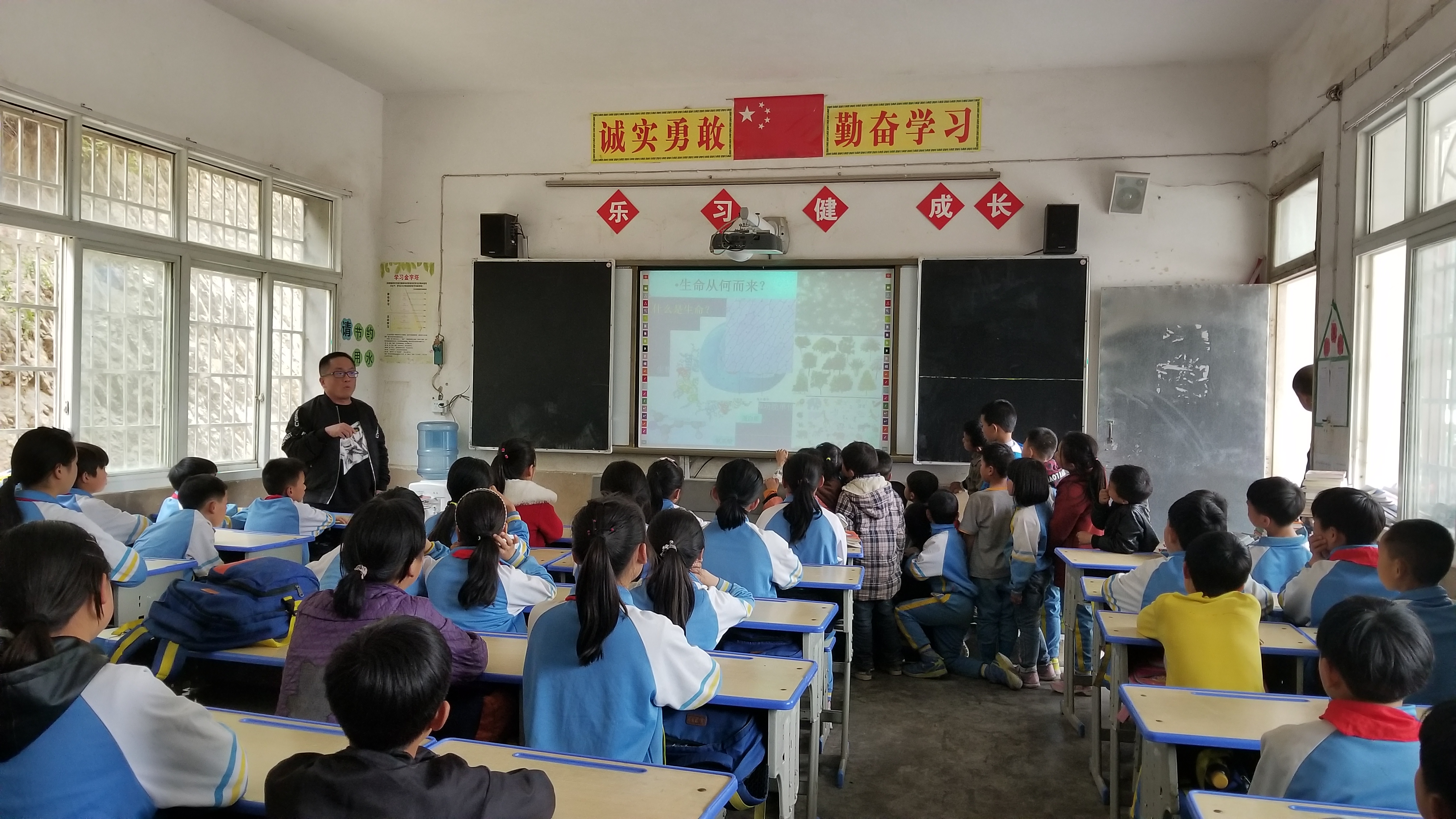 这一天,贵州省石阡县青阳苗族仡佬族侗族乡小学六年级的100多位师生迎来了特别的客人—成都地调中心武陵山成矿带酉阳—天柱地质矿产调查项目组成员。项目组吕涛工程师以“聆听地球的故事、呵护我们的家园”为主题,为学生们讲演了一堂精彩的科普讲座。课堂上,学生们对地球的形成、生命的演化,特别对恐龙的相关知识产生了浓厚的兴趣,并与讲演者开展了精彩的互动。