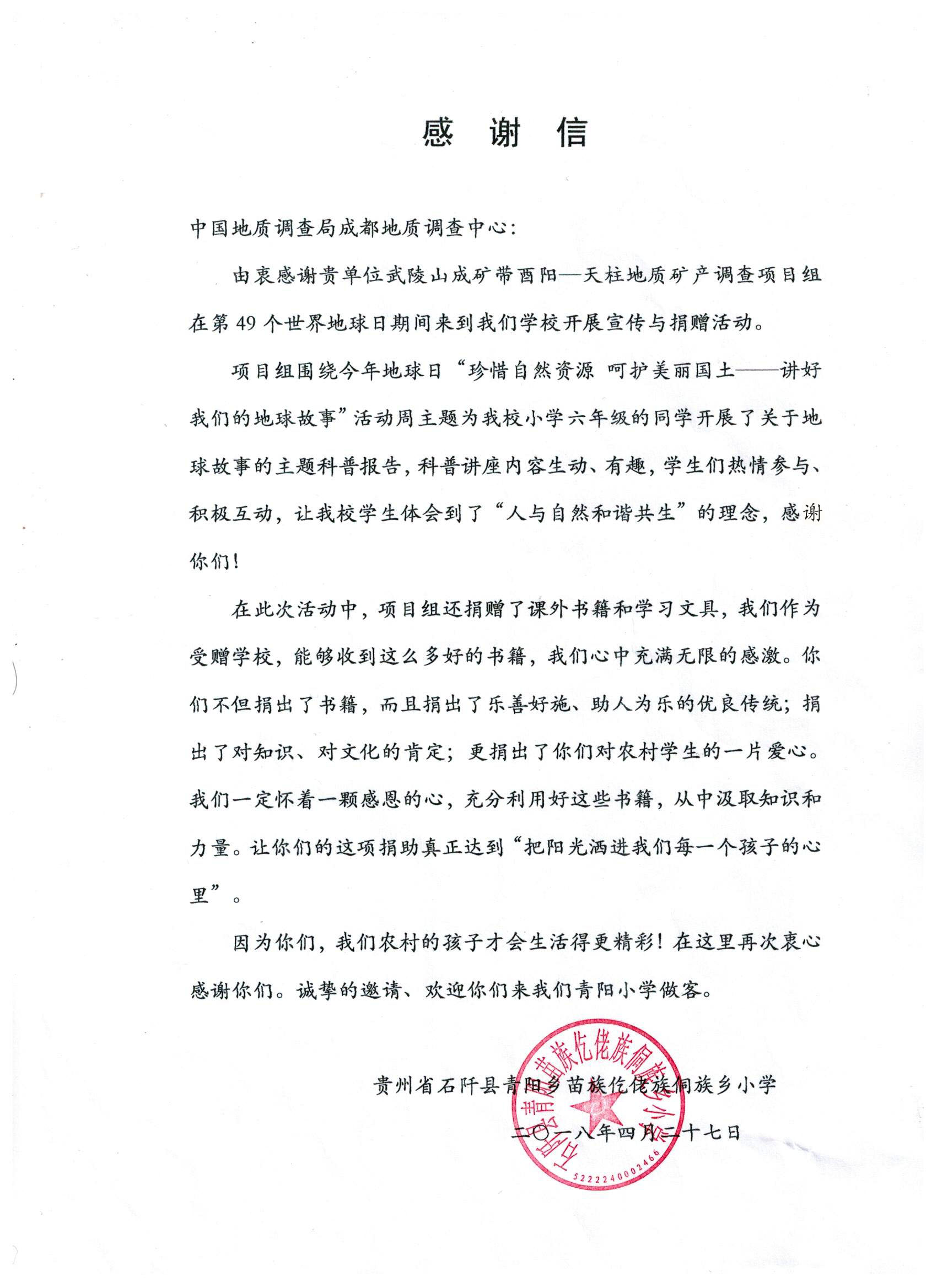 项目组了解到,青阳苗族仡佬族侗族乡小学地处的石阡县青阳乡是一个多民族聚居乡,在此上学的学生多为贫困留守儿童,全校甚至没有一个地球仪,当即向学校赠送了项目组募集的50余套课外书籍和学习文具以及8套地球仪。这一举动让学校教职工深受感动,活动后青阳小学专门给成都地调中心发来感谢信。