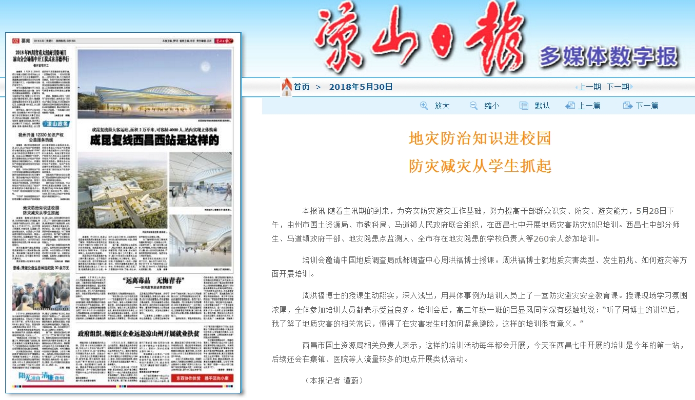 西昌市第七中学后山发育规模中等的滑坡隐患,直接威胁学校操场和教学楼。通过此次地质灾害科普培训活动,同学们表示对地质灾害有了更为深刻的认识,同时也掌握了地质灾害发生时的科学避难路线。此次科普培训活动也得到了相关媒体的大力支持,凉山州电视台和凉山日报均对此次科普培训进行了相应的报道。