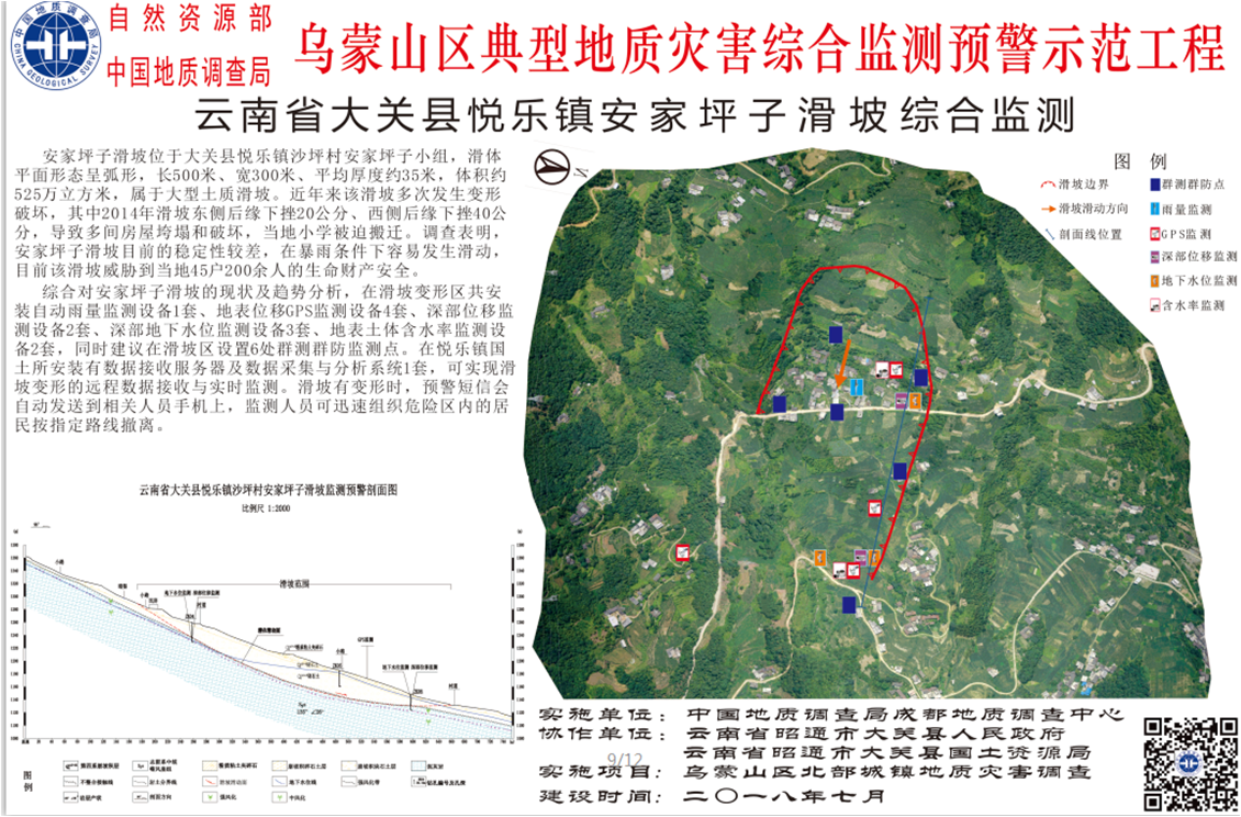 为保障乌蒙山区人民群众生命财产安全,提升地质灾害综合防治支撑能力,支撑自然资源部地质灾害防治工作,自然资源部中国地质调查局成都地质调查中心结合大关县人民政府对提高群专结合防灾减灾能力的需求,充分发挥专业技术优势,与大关县人民政府联合共建了安家坪子滑坡监测预警示范点。