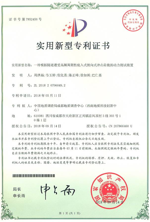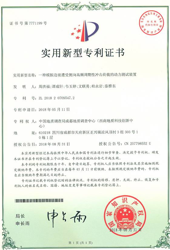 近日,由自然资源部中国地质调查局成都地质调查中心申报的2项实用新型专利“一种模拟边坡遭受侧向高频周期性冲击荷载的动力测试装置”和“一种模拟隧道遭受高频周期性底入式侧向式冲击荷载的动力测试装置”,顺利通过国家知识产权局审核并获得授权(专利号:ZL2018 2 0709547.2和ZL2018 2 0706049.2)。