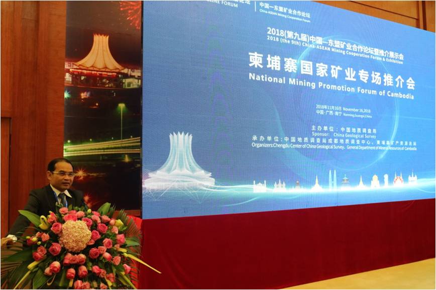 为促进中柬矿业领域合作,服务“一带一路”建设,实现中柬双方合作共赢,2018年11月16日,柬埔寨国家矿业专场推介会在广西南宁第九届中国-东盟矿业合作论坛上成功举办。此次推介会由自然资源部中国地质调查局主办,中国地质调查局成都地质调查中心和柬埔寨矿产资源总局联合承办。成都地调中心主任、党委副书记,中国-东盟地学合作中心主任李文昌和柬埔寨矿业与能源部矿产资源总局局长尤•摩尼拉先生共同主持会议。中国地质调查局科外部副主任刘凤山代表中方致辞,柬埔寨能源矿产部国务秘书蒙•撒提拉出席会议并代表柬方致辞,柬埔寨能源矿产部彭•那乌、聂•首枚、索恩•蒙克三位副国务秘书出席会议。