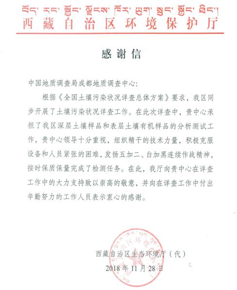 近日,西藏自治区环境保护厅向自然资源部中国地质调查局成都地质调查中心发来感谢信,感谢成都地调中心按时保质高效完成西藏自治区农用地土壤污染状况详查样品检测及数据上报工作。目前检测结果已全部通过国家质控系统数据审核。