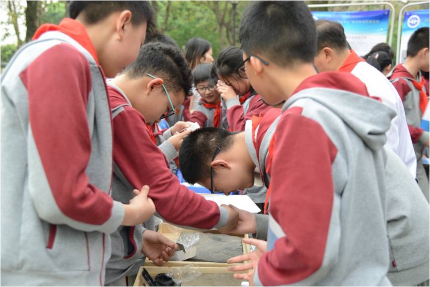 看到两亿年前的生物化石,学生们兴奋无比,纷纷拿起放大镜一探究竟。这一眼就是两亿年,地史时期和现实竟也只剩下一个放大镜的距离,学生们实在惊呼不已。这些珍贵的化石,激发了同学们热爱科学、崇尚科学、探索科学的激情,更让他们感受到了科学之美!