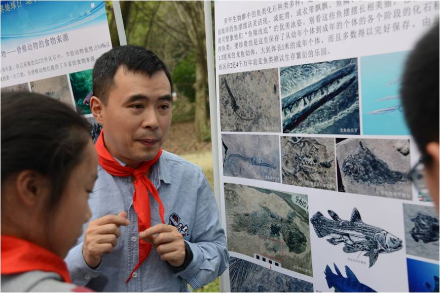 成都地调中心留德博士胡世学从事罗平生物群研究多年,向学生们详细介绍了罗平生物群的构成,包括海生爬行类、鱼类、节肢类为主,伴生有棘皮动物、菊石、双壳、腹足类、有孔虫、介形虫、植物等10多大类的海洋生物化石群,并对比了这些化石和现代生物的相似性,还强调了保护化石和地球的重要性。当同学们从黄金元博士口中得知地史时期有5次大规模的灭绝事件,其中二叠纪三叠纪之交的生物灭绝事件,是规模最大的一次时,不禁惊呼起来。那些二叠纪三叠纪之交的罗平生物群化石更是瞬间点燃了同学们的兴趣和热情!