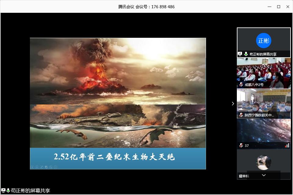 为了传播“珍爱地球,人与自然和谐共生”的理念,自然资源部中国地质调查局成都地质调查中心联合四川省科学技术协会开通空中课堂,以视频连线方式为成都市第八中学、陕西省宁强县铁锁关镇初级中学的师生们讲述罗平生物群2.4亿年前的故事,普及相关地球科学知识。主讲工作由获得中国地质调查局“优秀科普传播青年”称号的文芠承担。提问抢答环节热闹非凡,同学们积极连线互动,大大的口罩掩盖不住同学们对于探索地球奥秘的好奇心和求知欲。成都地调中心党委书记、副主任胡时友参加了上述活动。