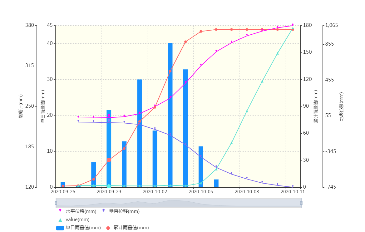 本次滑坡险情主要是因为9月28日至10月6日的持续强降雨诱发,成都地调中心在这些滑坡上布设的普适型滑坡监测预警设备及时捕捉到了滑坡的加速变形并发出预警,累计发出预警68次,其中红色预警13次。据监测显示,从雨量计黄色预警到裂缝计等设备的红色预警时间,从几个小时到十几个小时不等。实践证明,对于此类降雨缓变型土质滑坡,采用降雨量、地表位移和控制性裂缝等多参数联合监测可起到较好的监测预警效果。