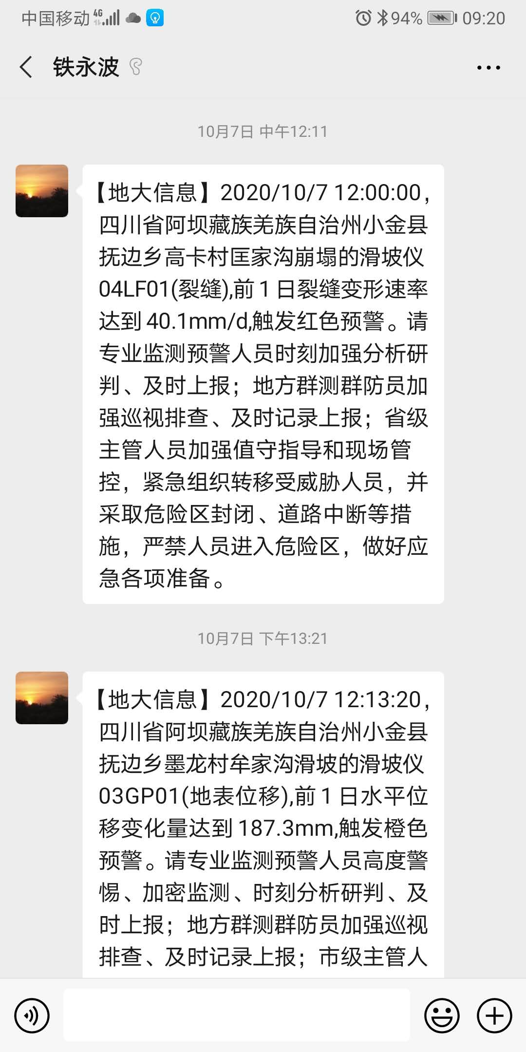 2020年10月6日至7日,正值国庆假期期间,自然资源部中国地质调查局成都地质调查中心在四川省小金县扶边乡墨龙村牟家沟滑坡、胥家山村梁子包包滑坡、高卡村匡家沟滑坡实施的滑坡监测预警实验先后发出预警。成都地调中心技术人员立即与小金县自然资源局值班领导、一线监测人员紧急会商,综合研判滑坡的稳定现状和变形趋势,提出应急处置对策建议,地方政府迅速赶赴现场开展应急处置工作。期间,牟家沟、匡家沟滑坡前缘均出现局部滑动致使公路挡土墙损毁且造成局部断道,所幸监测预警和人员撤离及时,未造成人员伤亡。