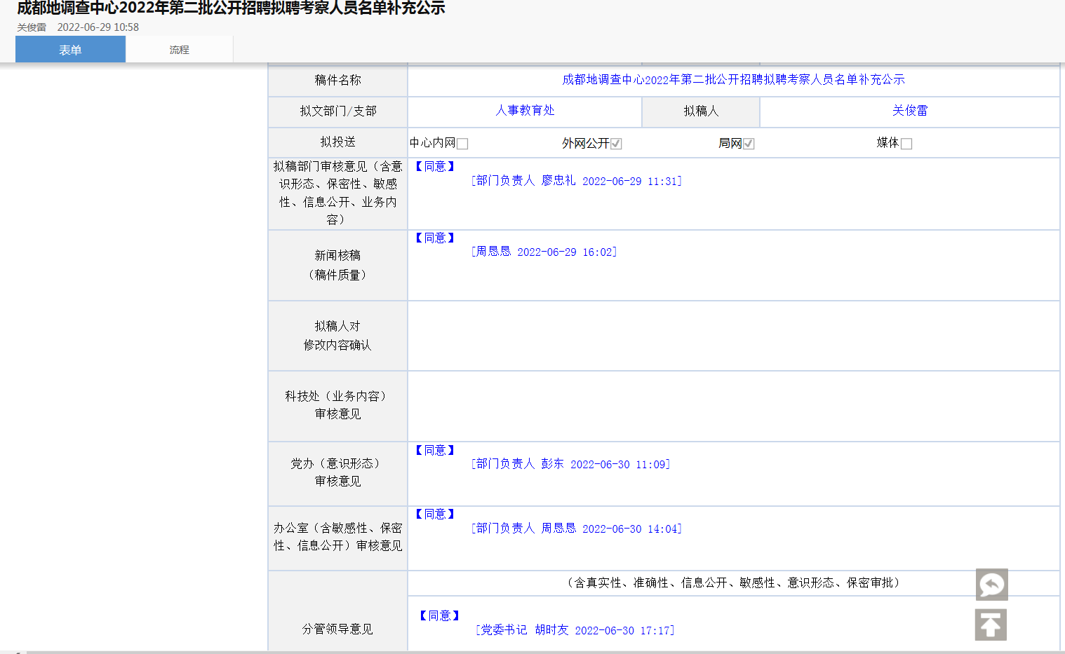 根据《中国地质调查局成都地质调查中心2022年第二批公开招聘公告》,通过发布公告、自愿报名、资格审查并公示、考核等程序,现将拟聘考察人员名单公示如下: