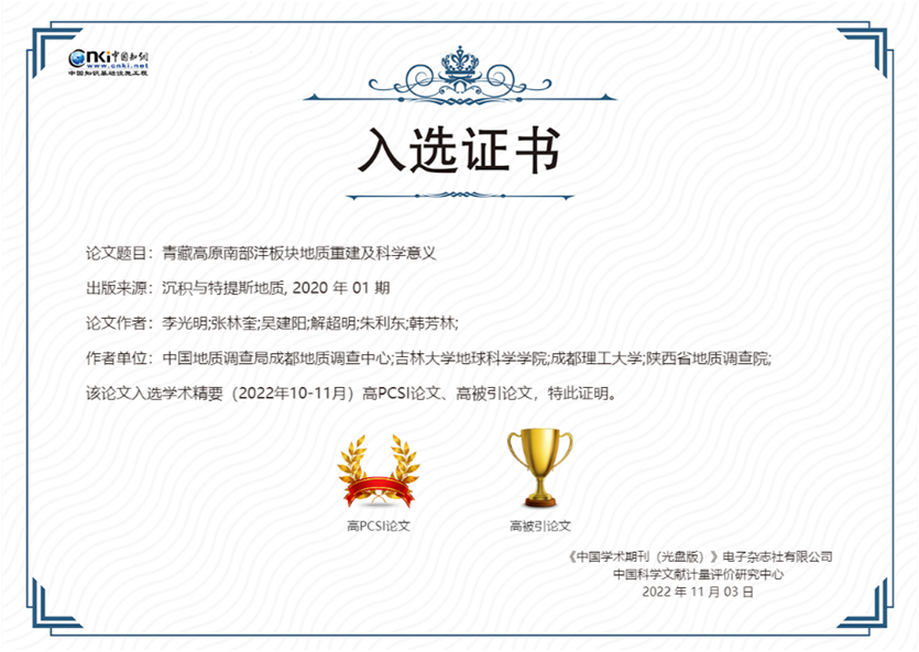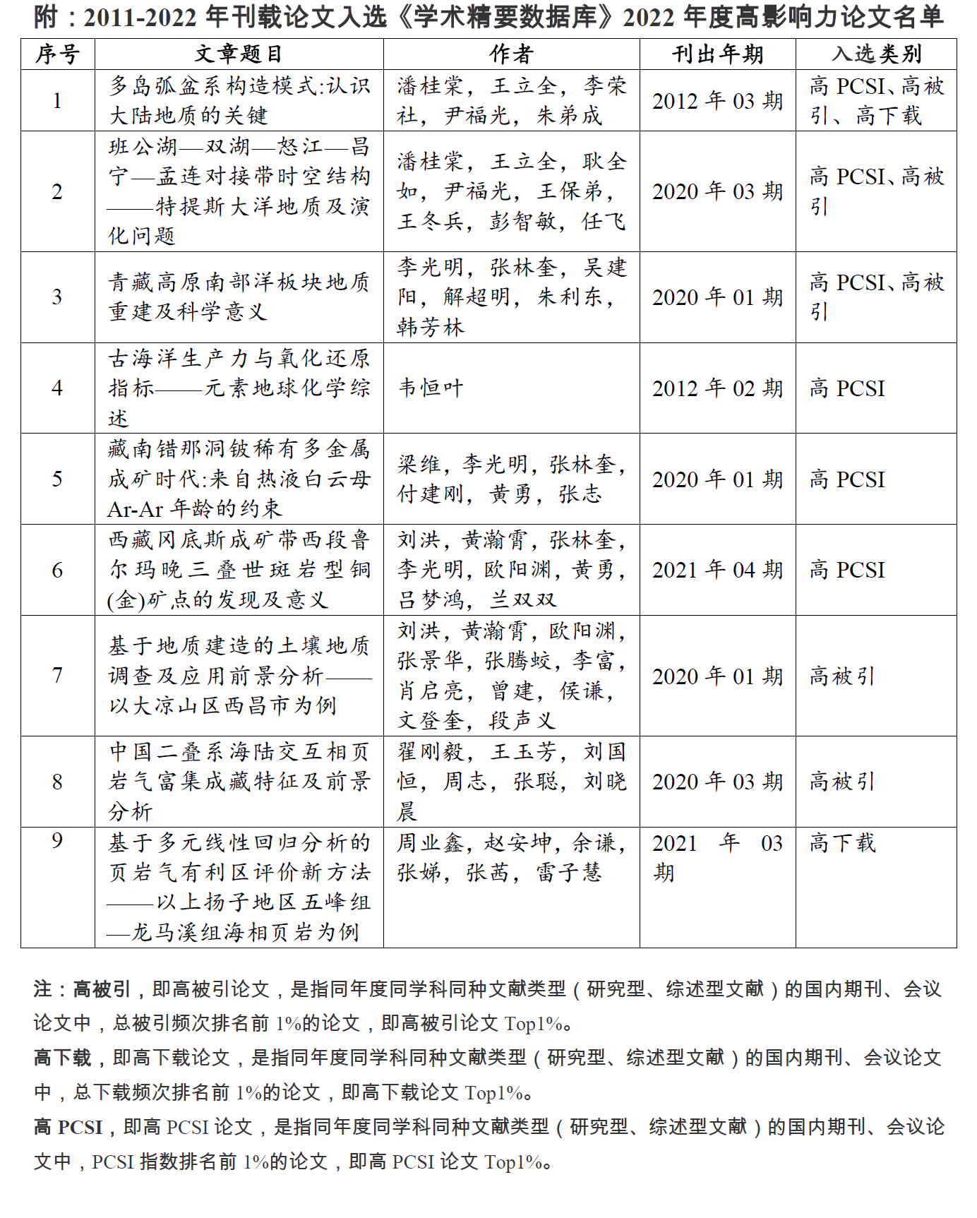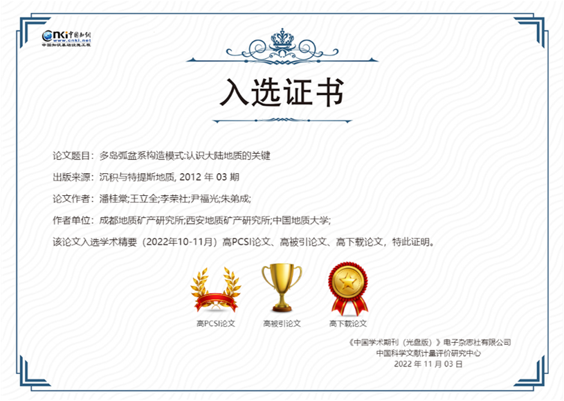 经检索,我中心主办的《沉积与特提斯地质》期刊共有79篇。2011年以来刊载的论文入选了2022年度《学术精要数据库》,其中“高PCSI”、“高被引”和“高下载”等高影响力论文共9篇。