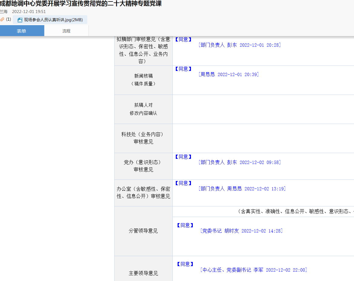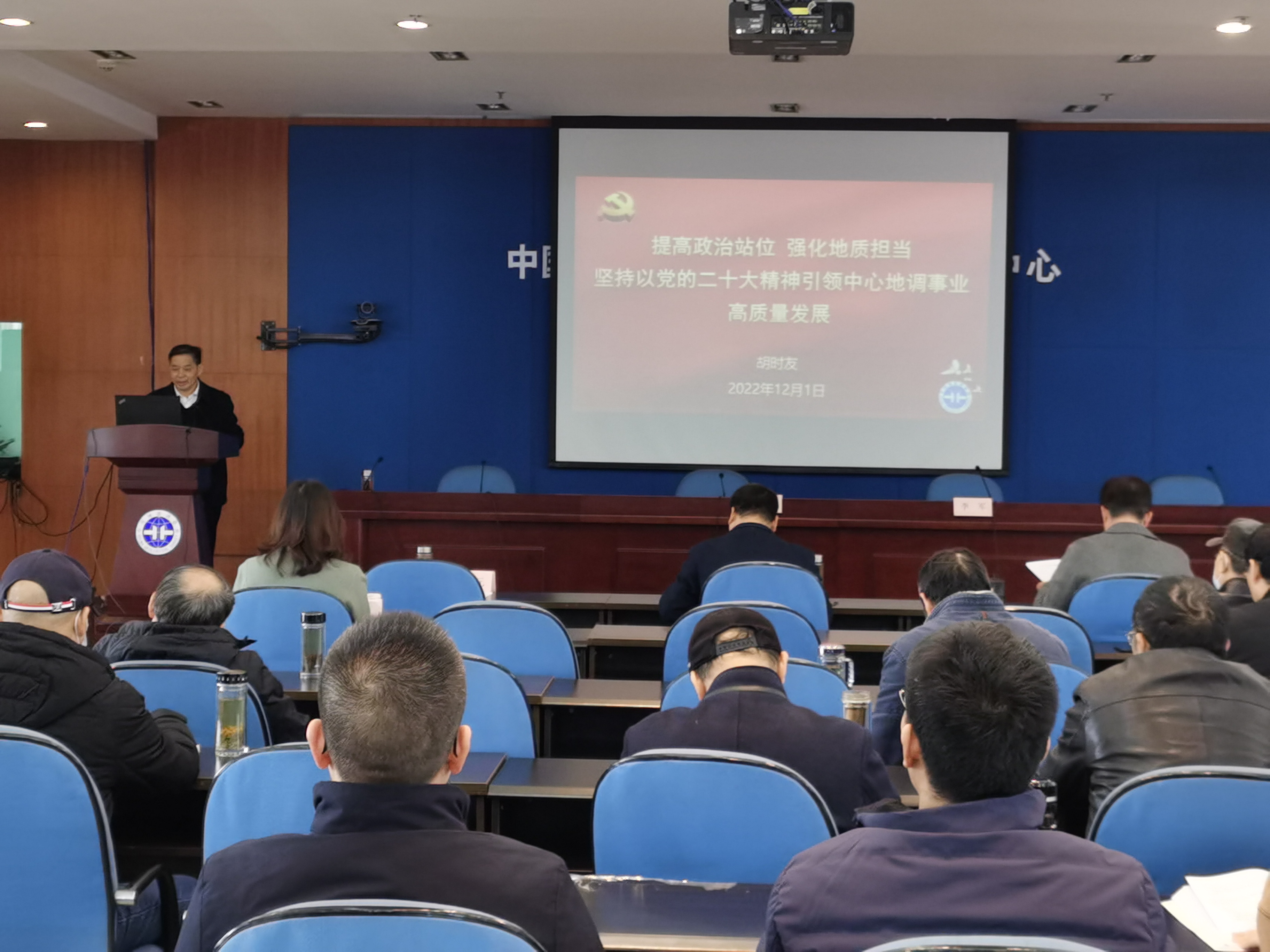 12月1日,中国地质调查局成都地质调查中心党委通过线上与线下相结合的方式,召开全体党员大会,由中心党委书记、副主任胡时友主讲“提高政治站位、强化地质担当,坚持以党的二十大精神引领中心地调事业高质量发展”专题党课。会议由中心主任、党委副书记李军主持。