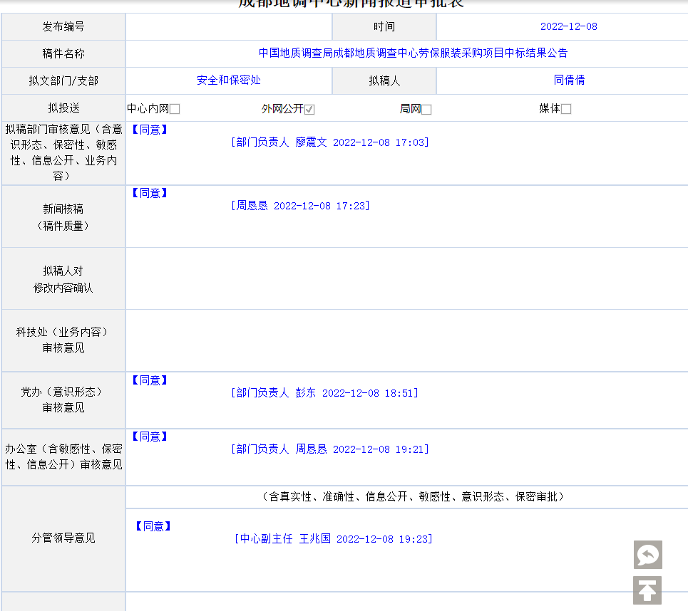 中国地质调查局成都地质调查中心委托五矿国际招标有限责任公司采用公开招标方式采购的劳保服装项目,于2022年12月08日完成评审工作,现将评审结果公告如下: