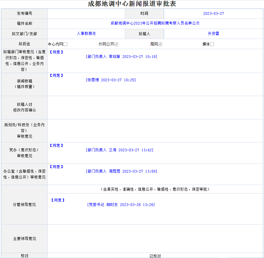 根据《中国地质调查局成都地质调查中心2023年公开招聘公告》,通过发布公告、自愿报名、资格审查并公示、考试等程序,现将拟聘考察人员名单公示如下: